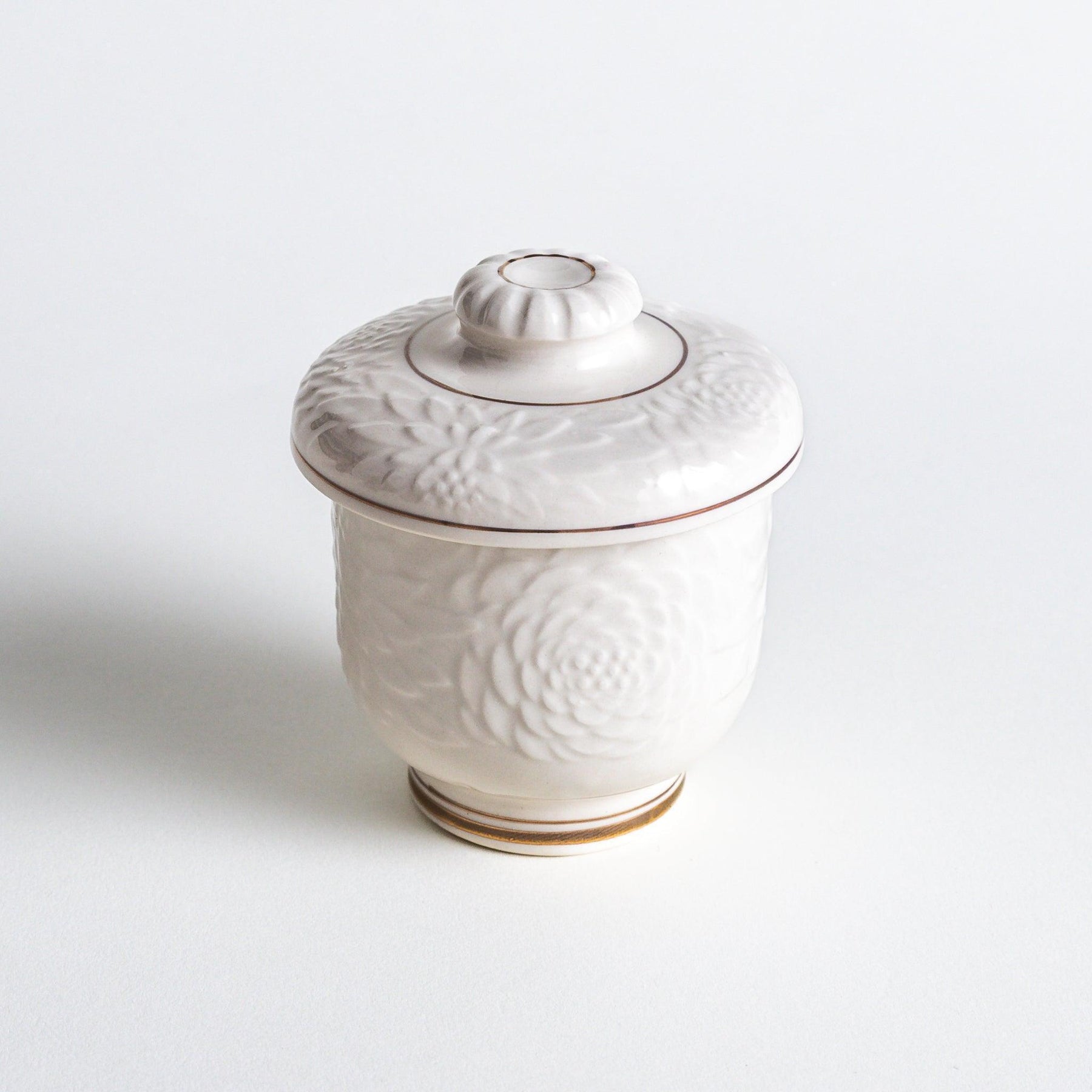 The Chrysanthemum Carved Chawanmushi Bowl with matching lid is a refined piece of Mino ware, designed for both steaming and serving Japan’s beloved savory egg custard. The exterior features a chrysanthemum motif delicately carved in relief, symbolizing longevity and elegance. An ivory-white glaze softly highlights the floral design, while fine gold accents along the lid and base add a touch of sophistication.