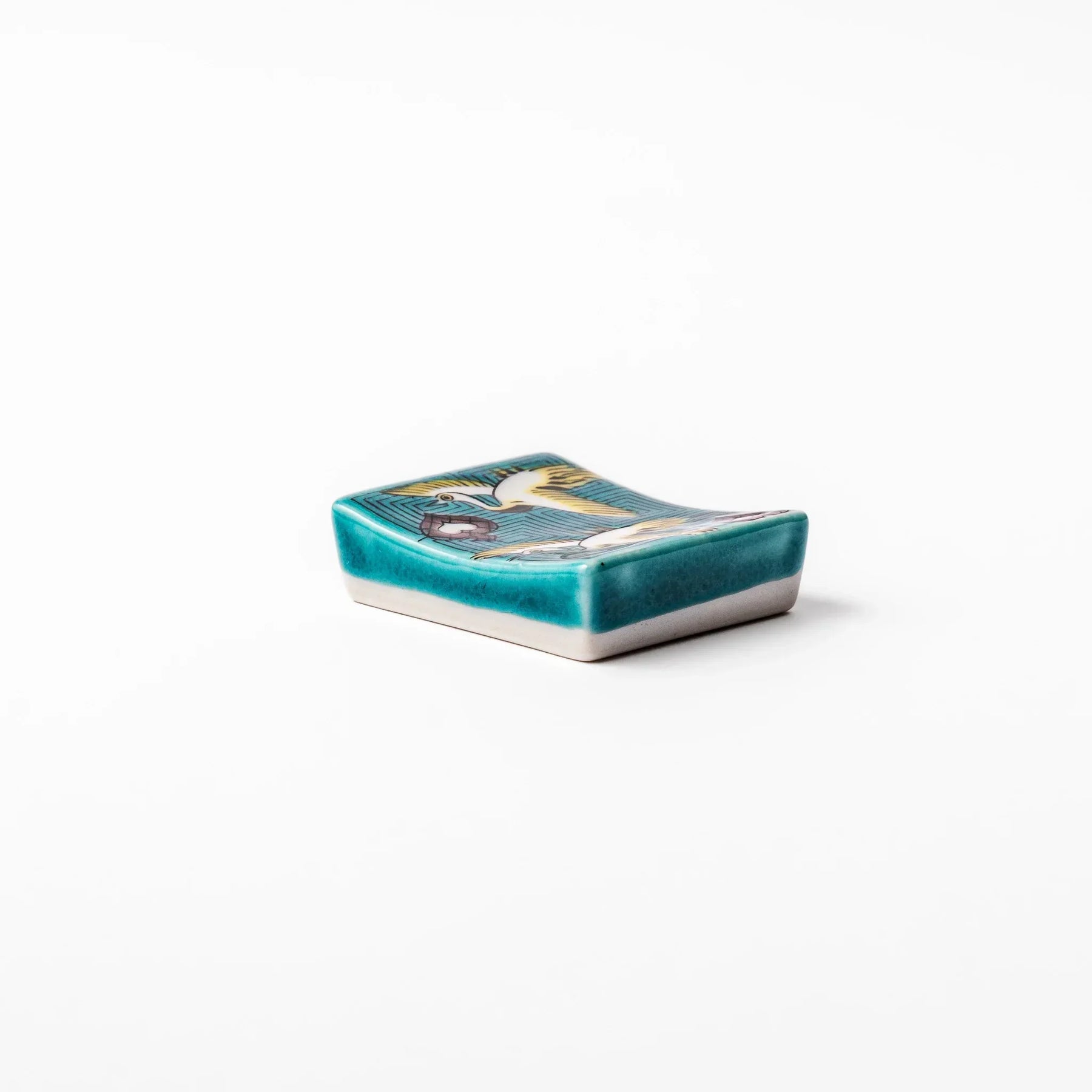 Bring grace and tradition to your dining table with the Flying Crane Chopstick Rest. Handcrafted in Japan, this porcelain rest features vibrant yellow cranes in flight over a teal geometric background—symbolizing longevity and good fortune in Japanese culture.