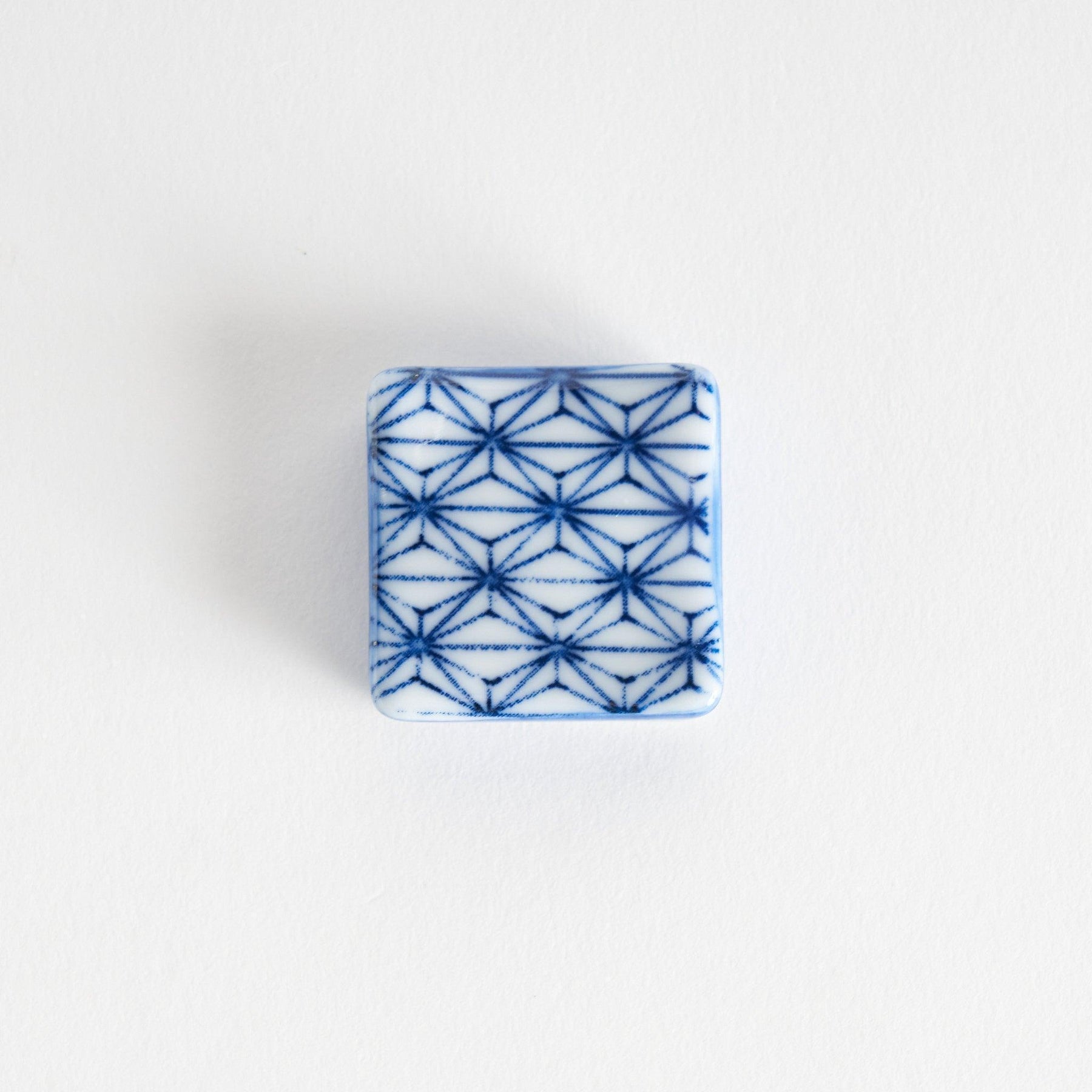 The Hemp Star Square Chopstick Rest features the traditional asanoha, or hemp leaf, motif in vivid indigo on white porcelain. This geometric design has been cherished in Japan since the Heian period, where it was believed to protect against misfortune and symbolize healthy growth, especially for children. Its sharp lines and repeating pattern create a timeless look that continues to resonate in Japanese design today.