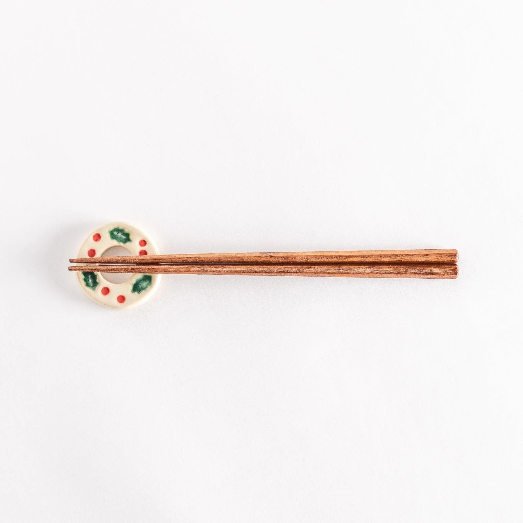 Each piece is handcrafted by skilled artisans in Japan, offering a gentle, handmade quality that sets it apart from mass-produced items. The surface features detailed holly leaves and berry-like dots, evoking classic Christmas imagery while still feeling subtle and tasteful. Its circular form keeps chopsticks neatly in place and brings a joyful seasonal touch to mealtimes.