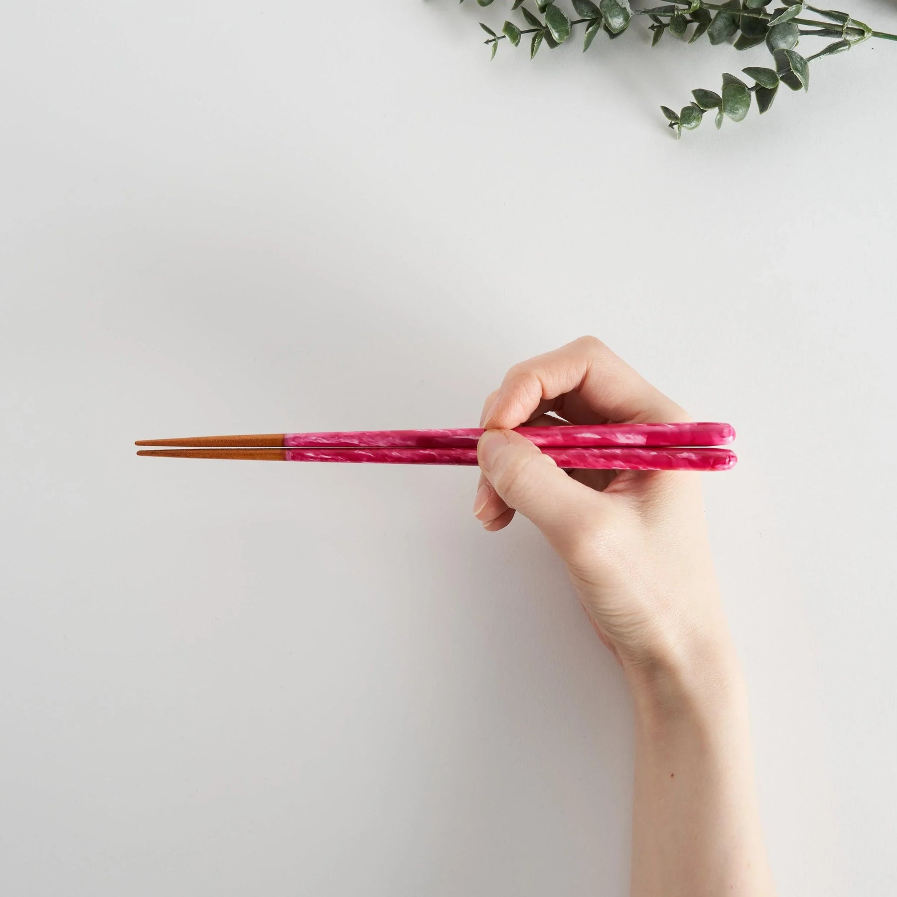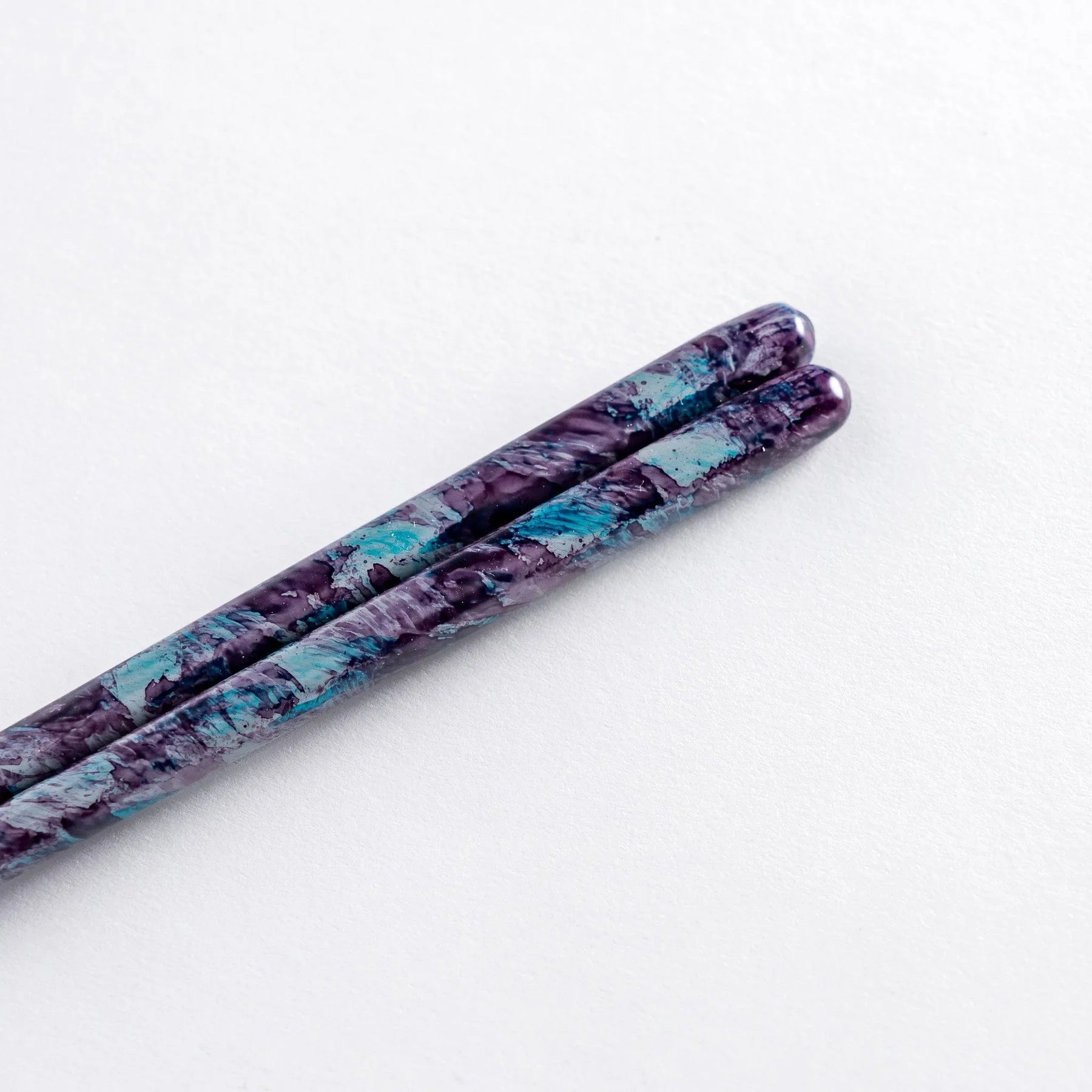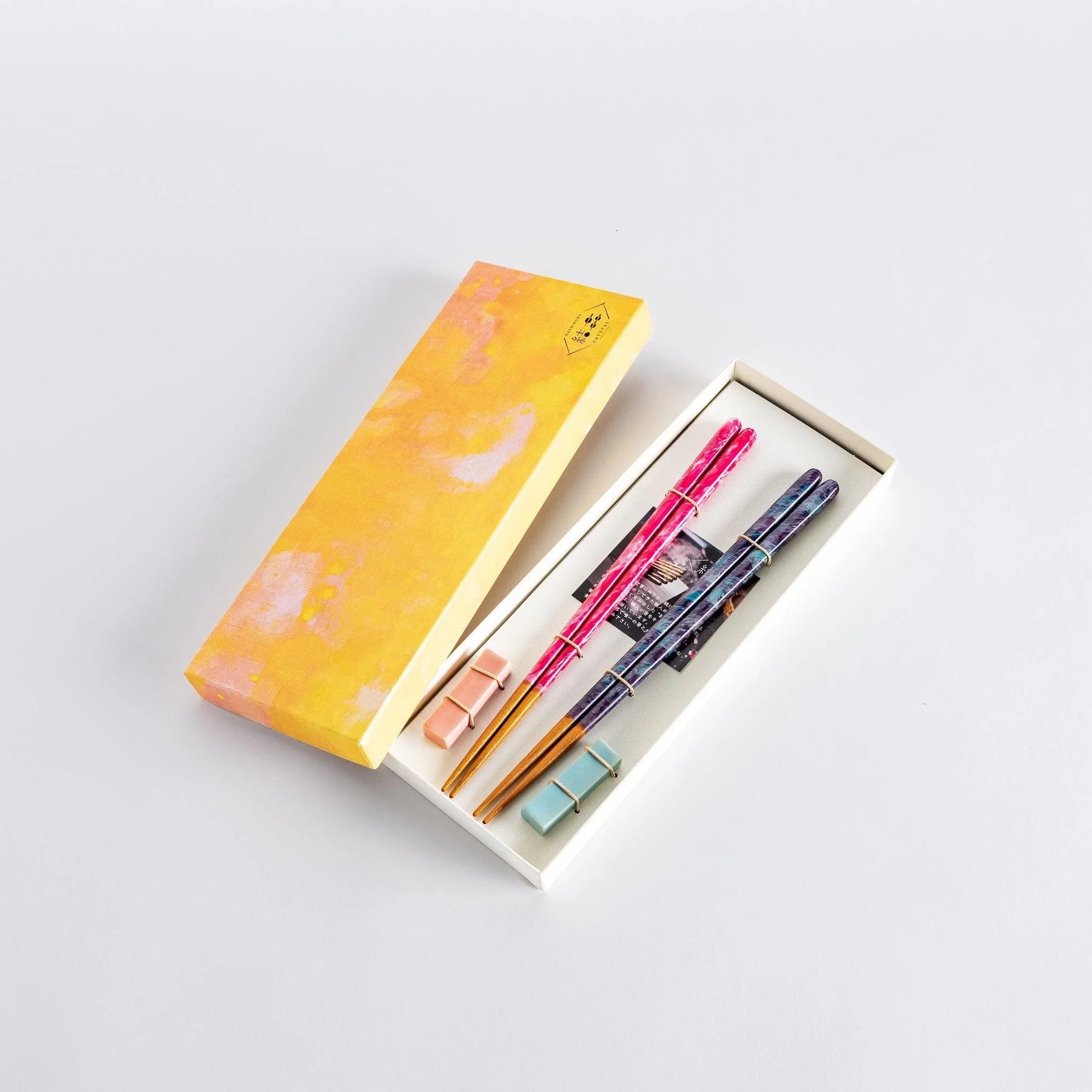 The Dreamy Wisteria Blossom Chopsticks Set brings a touch of elegance and celebration to the dining table. Each pair is adorned with vibrant marble-like patterns, one in soft pinks inspired by blooming cherry blossoms and the other in purples recalling cascading wisteria. The smooth, tapered wooden tips provide comfort and ease of use, while the glossy upper finish highlights their artistry.