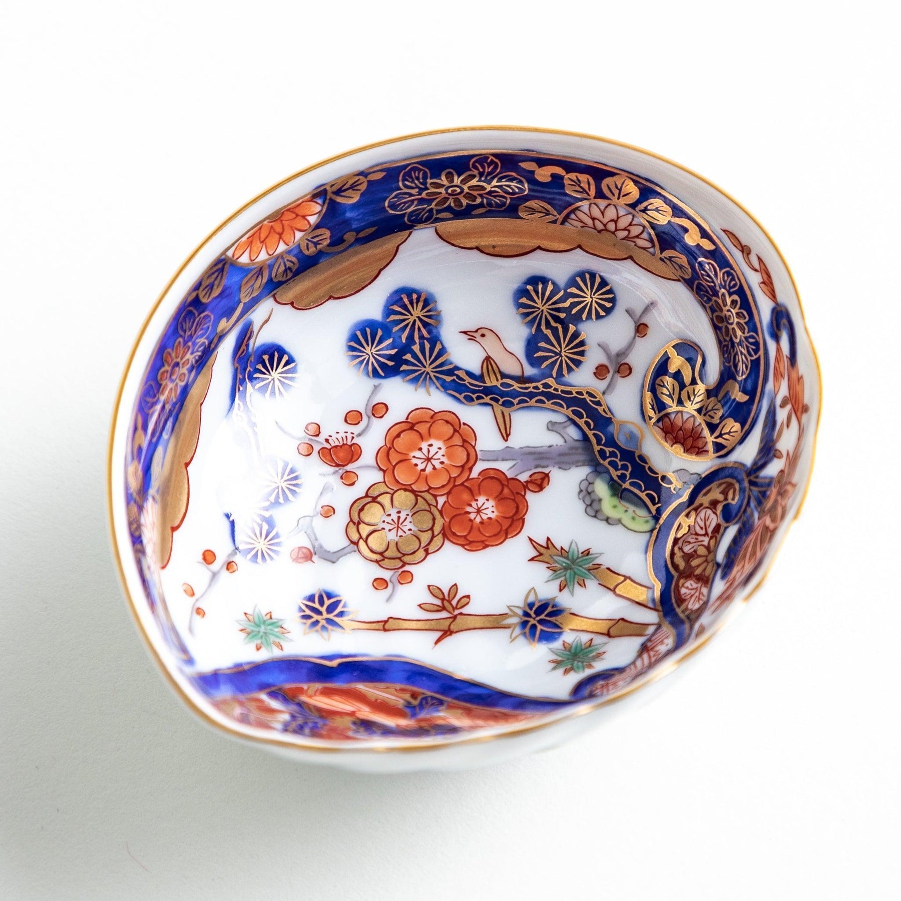 The Pine Bamboo Plum with Bird Condiment Bowl is a striking piece of Imari Ware, shaped in an elegant abalone form that immediately draws the eye. Its surface is richly decorated with auspicious motifs of pine, bamboo, plum, and a graceful bird, painted in vivid shades of red, blue, green, and accented with touches of gold. Together, these elements symbolize good fortune, resilience, and celebration.