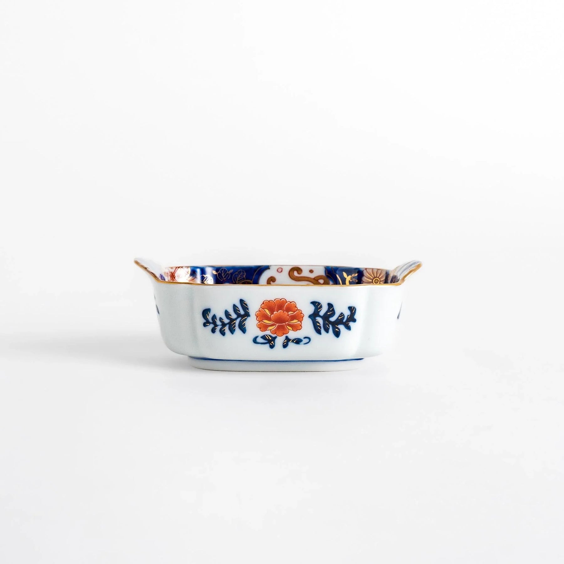 The Pine Bamboo Plum with Crane Condiment Bowl by Shobido Honten is a graceful piece of Imari Ware that carries deep cultural symbolism. Adorned with pine, bamboo, plum blossoms, and a crane, it combines motifs long associated with resilience, renewal, and longevity. Rendered in vivid hues of red, blue, green, and gold, the design glows with festive brilliance while maintaining timeless elegance.