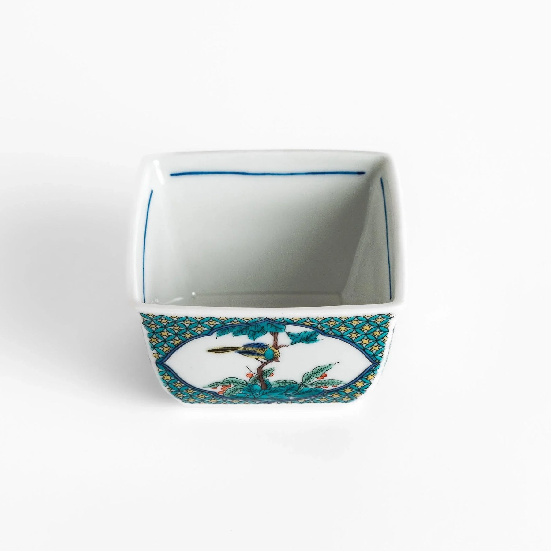 The Traditional Flower and Bird Condiment Bowl captures the elegance of Kutani Ware, renowned for its refined hand-painted artistry. Each side of this square bowl is adorned with a lively scene of birds perched among blooming flowers, framed by detailed geometric patterns that highlight the precision and depth of traditional craftsmanship. The striking blend of turquoise, red, and gold adds vibrancy while maintaining a sense of timeless Japanese beauty.