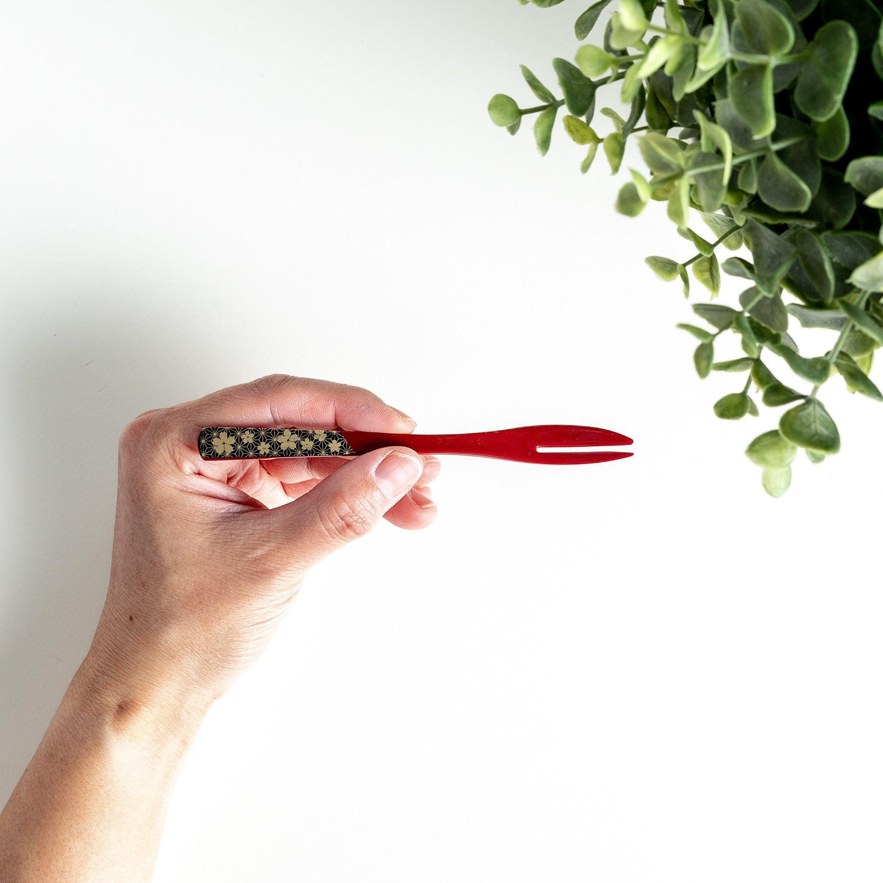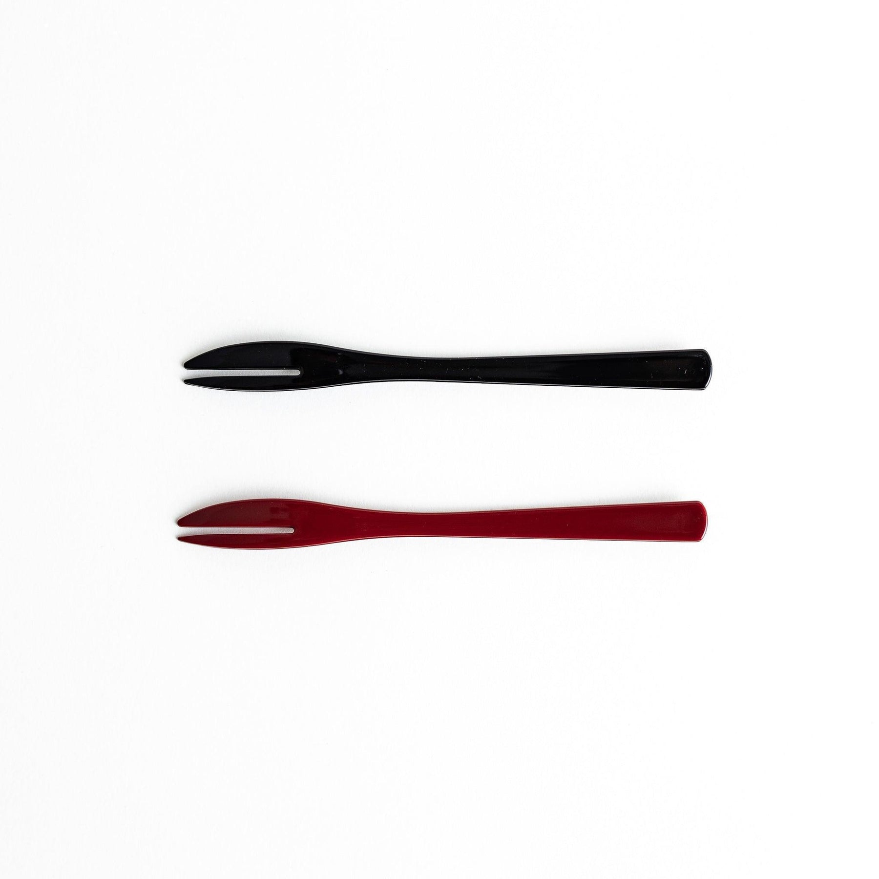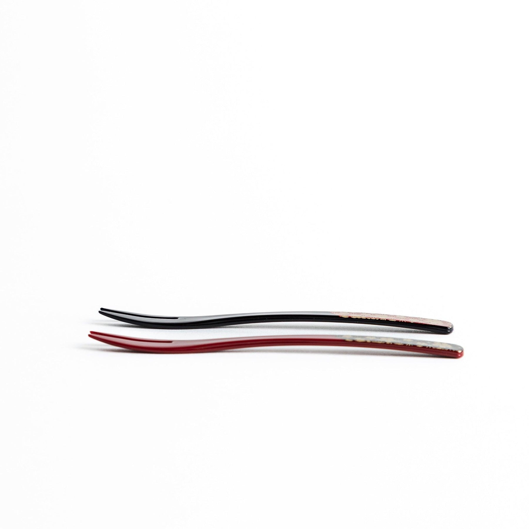 The Sakura Wagashi Fork Set includes two elegant forks designed for serving wagashi such as daifuku, yokan, and seasonal fruits. One features a deep red handle, the other black. Both are decorated with gold cherry blossoms and a traditional Japanese motif associated with protection and good fortune.