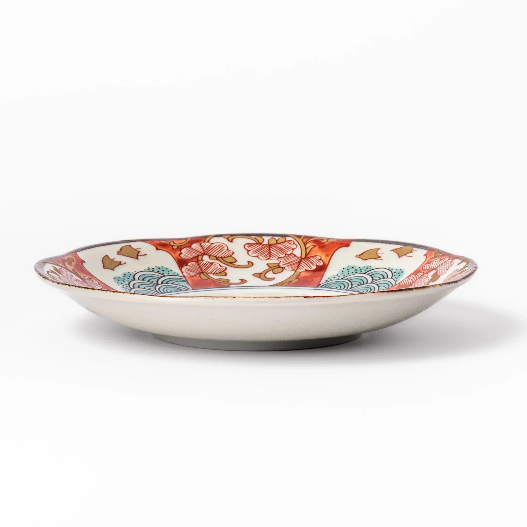 Bold yet balanced, the Golden Shorebird Dessert Plate showcases a vivid arrangement of seasonal motifs such as pine, stylized waves, and golden birds. Alternating panels of red, green, and white create a rhythm that blends tradition with quiet elegance.