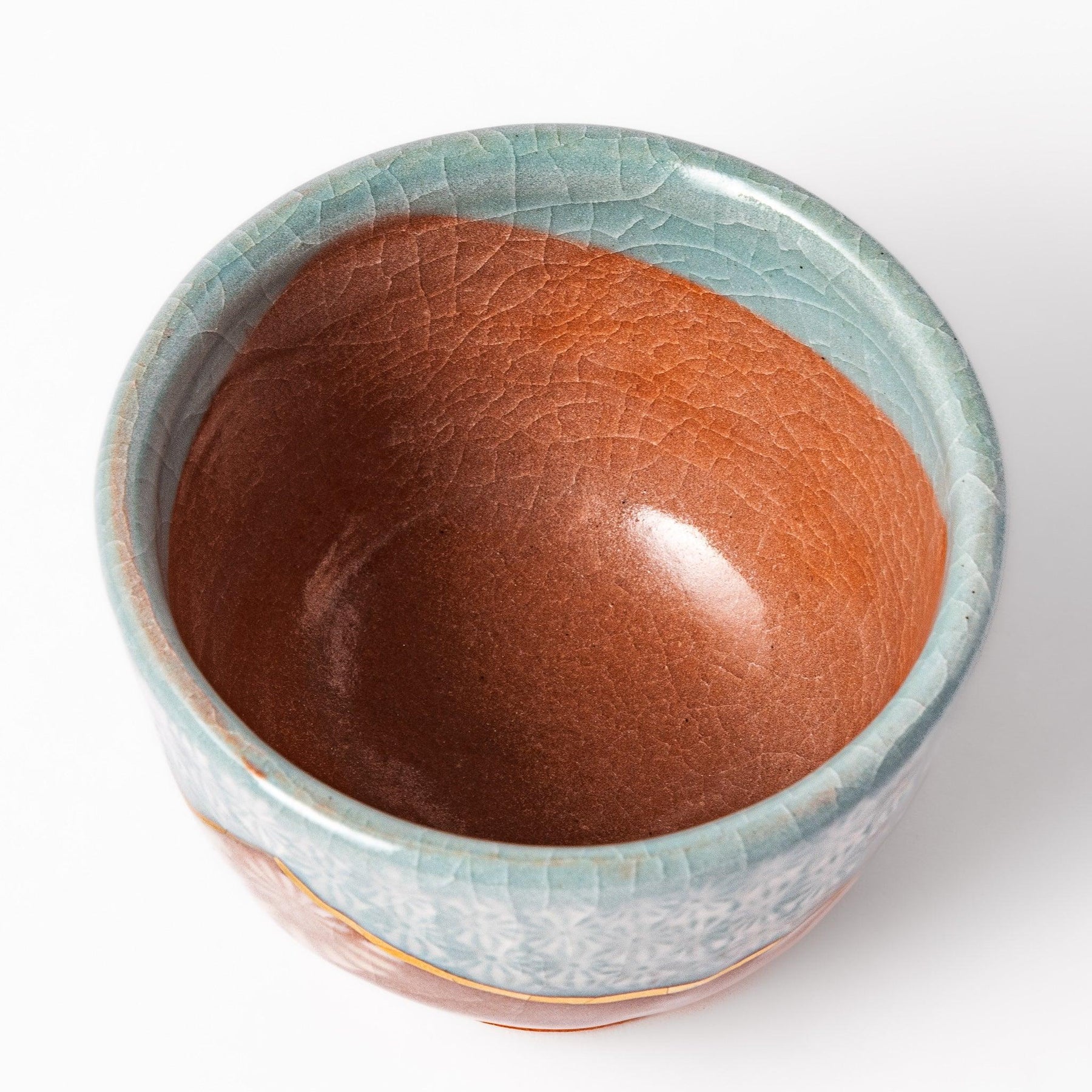 The Azure Floral Elegance Tea Cup brings together soft color and refined detail in a design that feels both graceful and inviting. The upper surface is decorated with a field of delicate floral patterns in pale blue, while the lower half features blossoms on a warm coral backdrop. Between them, a fine golden line gently separates the two areas, adding a sense of refinement and balance to the composition. The crackled glaze within the cup lends texture and depth, enhancing the tactile beauty of each tea moment.