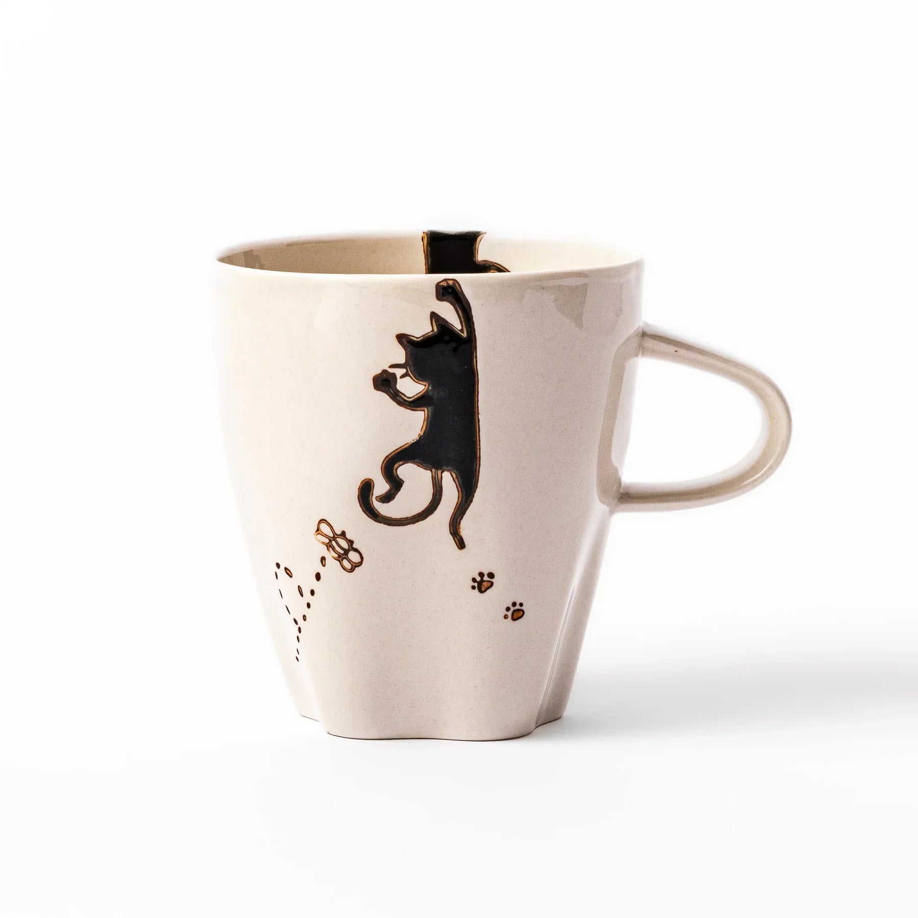 The Hanging Cat Paw Print Cup brings a warm, playful spirit to everyday moments. Each cup features a black, calico, or tabby cat clinging to the rim, with tiny paw prints and a fluttering dragonfly adding movement and charm to the design. The softly rounded form sits comfortably in the hands, making it a lovely choice for morning coffee, afternoon tea, or a cozy evening drink.