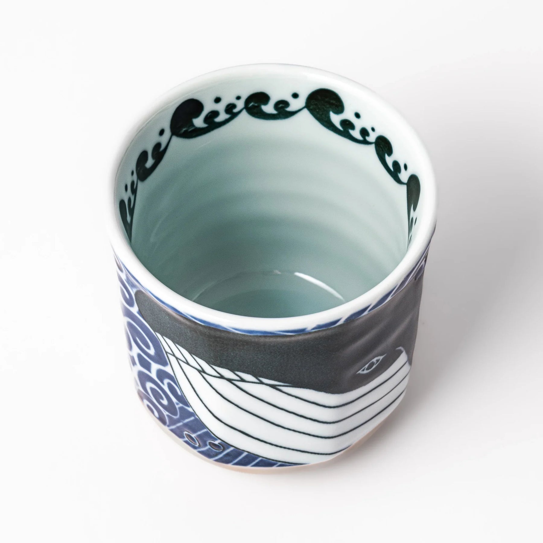 Dive into a whimsical blend of ocean life and Japanese artistry with the White Wave Whale Tea Cup, a charming yunomi featuring a swimming whale beneath swirling white waves. The deep indigo and crisp white design captures a playful yet serene scene, making every tea moment feel like a miniature journey beneath the sea.
