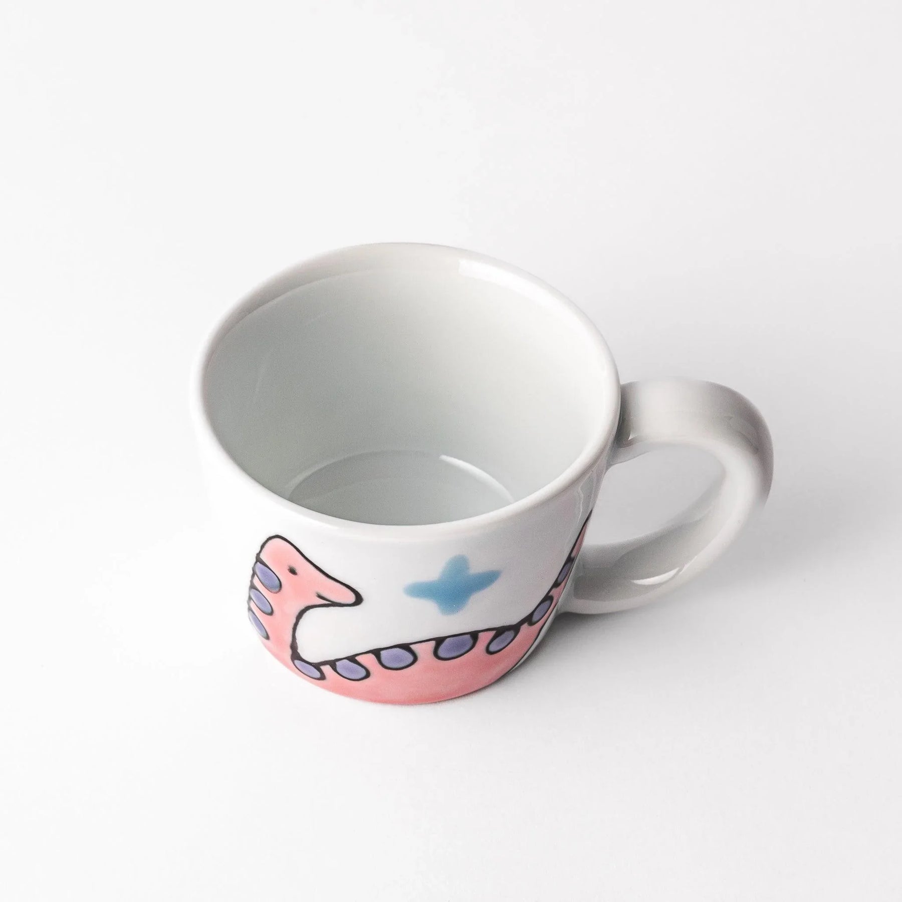 Roar into every sip with the Brachiosaurus Dino Kids Mug, where dinosaurs make drinks more fun. A cheerful pink Brachiosaurus walks across the cup, while a green dino soars on the other side, creating a playful scene that sparks imagination. The hand-painted design has a slightly raised texture, giving little hands a fun surprise to explore while they drink.