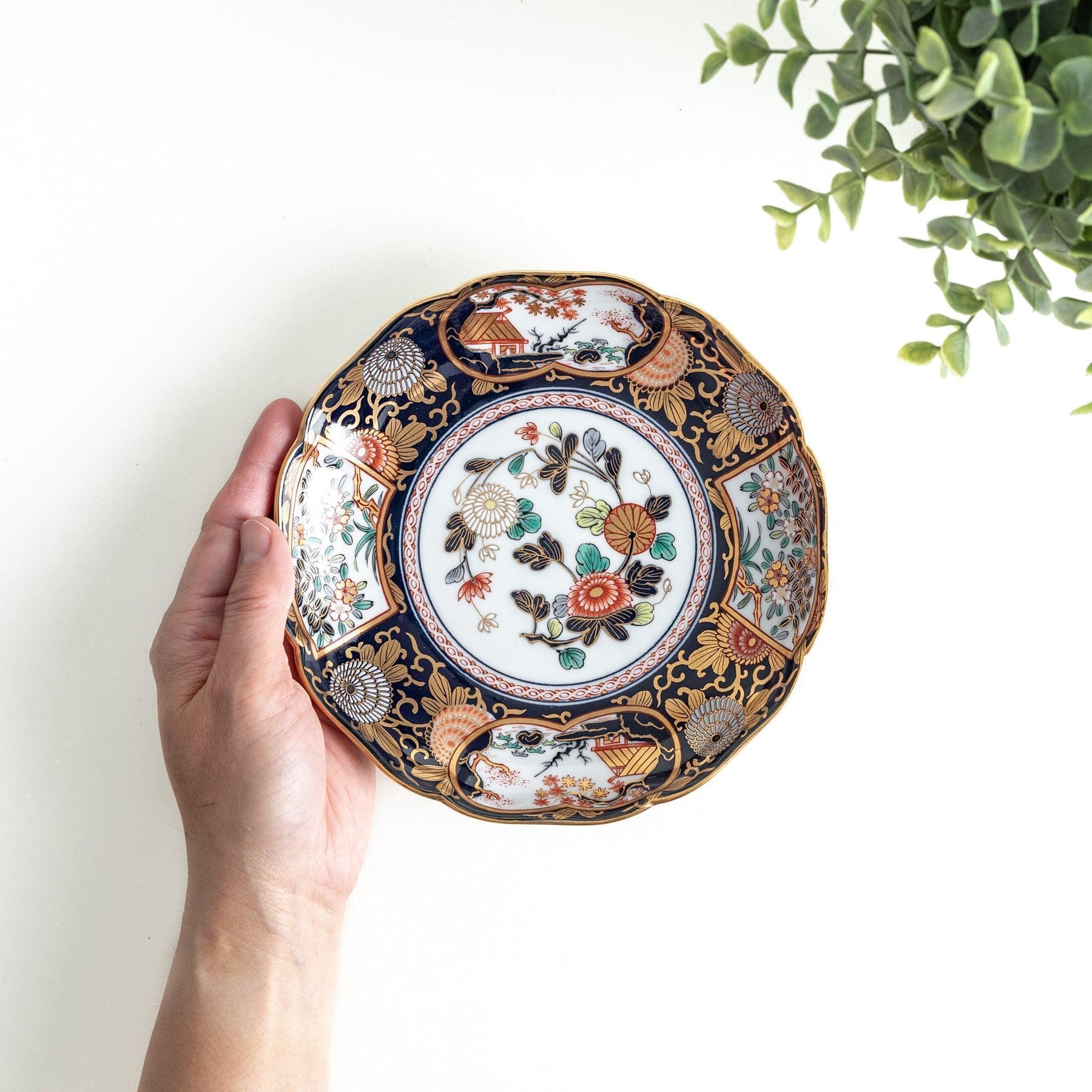 The Imperial Blossom Salad Plate showcases a richly detailed Ko-Imari style, featuring bold chrysanthemum blooms, maple leaves, and decorative cartouches framed in deep indigo and accented with gold. Crafted by Shobido Honten, a respected kiln in the Arita ware tradition, this plate blends classical motifs with precise overglaze enamel work to create a sense of timeless celebration.