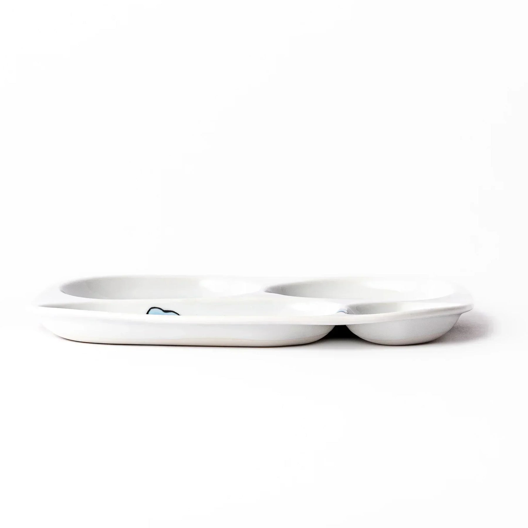 Japanese ceramic kids divided plate being hand decorated with playful vehicle motifs by an artisan at Oishin Kiln in Japan