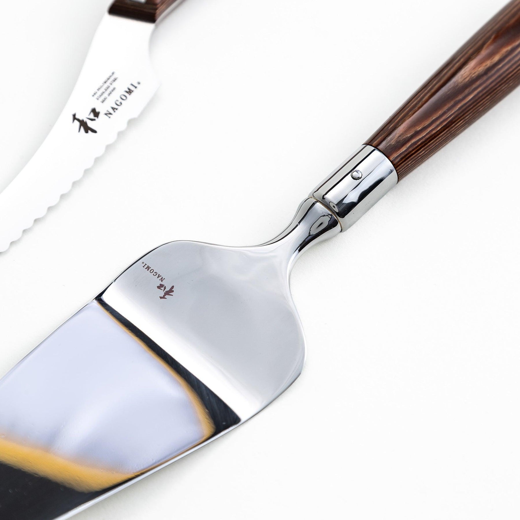 The matching server, with its polished stainless surface, lifts slices cleanly and securely, letting you present each piece with confidence. Both tools are finished with laminated wood handles that are not only comfortable to hold but also add natural warmth, reflecting the harmony of Japanese craftsmanship and modern design.