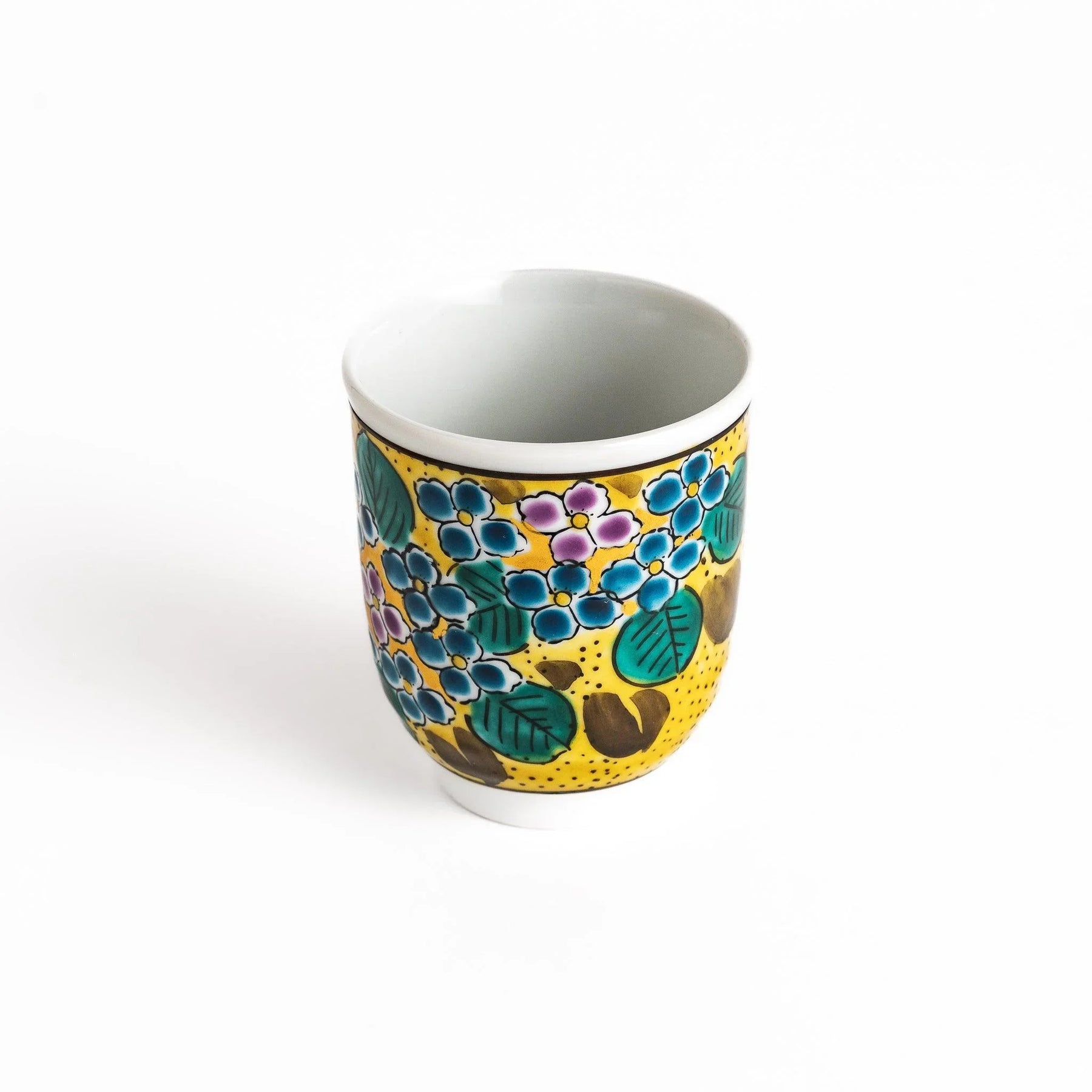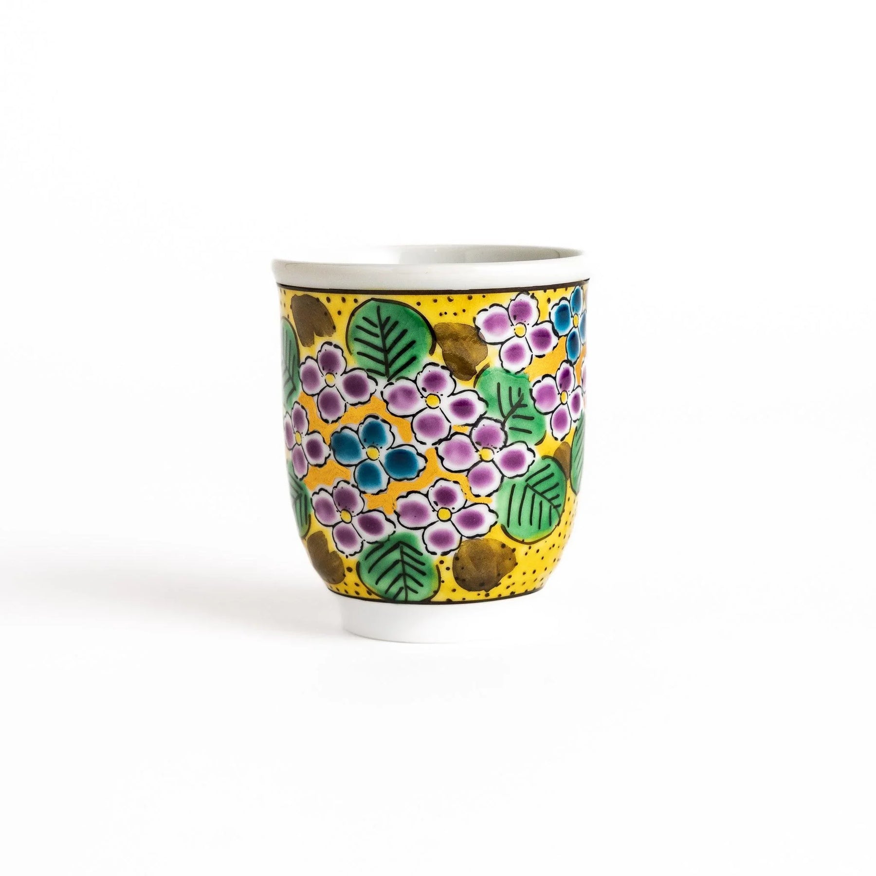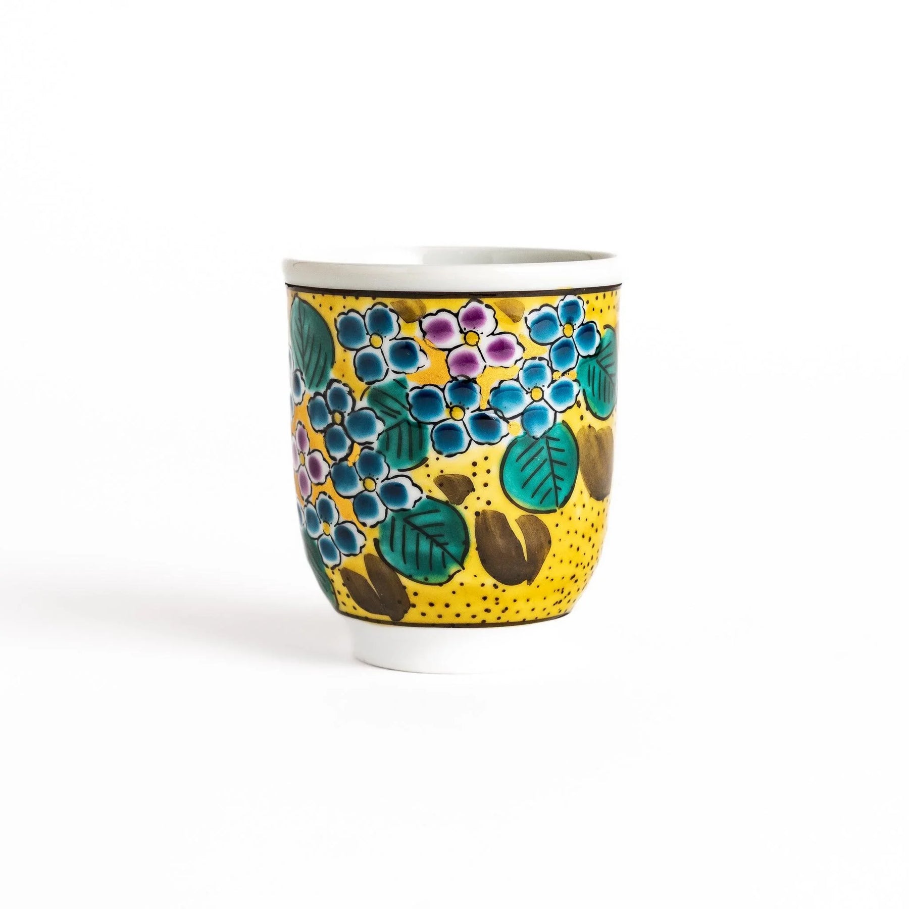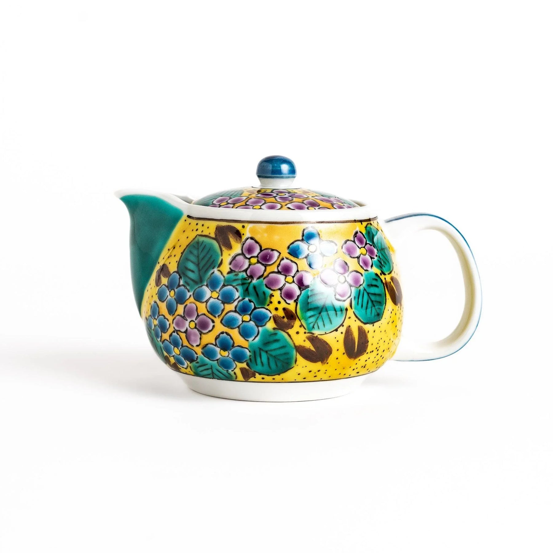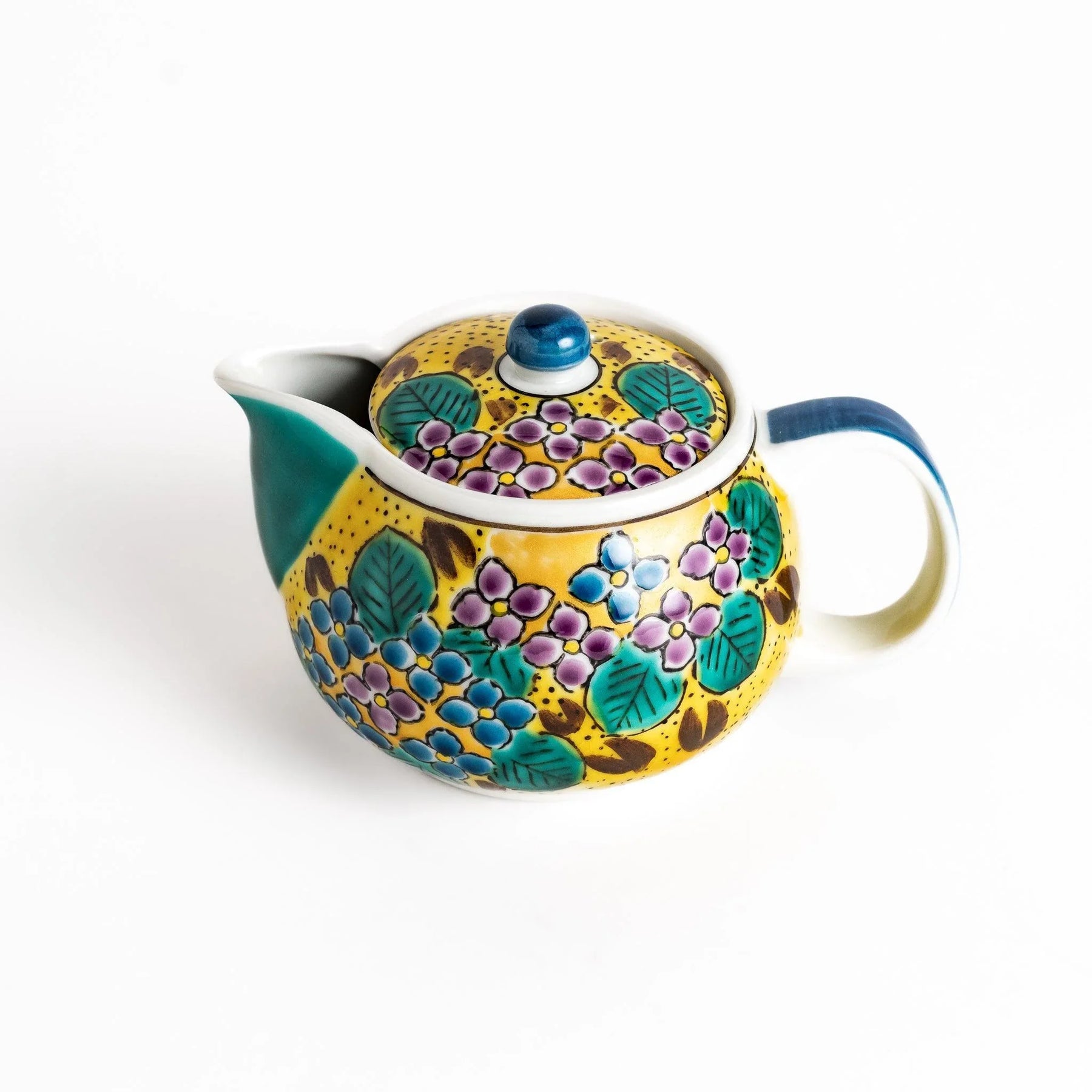 Bright and inviting, the Yellow Hydrangea Tea Set brings color and warmth to your tea ritual. Handcrafted in Kutani ware, this set includes a teapot and two matching cups, each decorated with blooming hydrangeas in vibrant shades of yellow, green, purple, and soft blue. The cheerful design recalls summer gardens in full bloom, turning each pour of tea into a joyful moment.