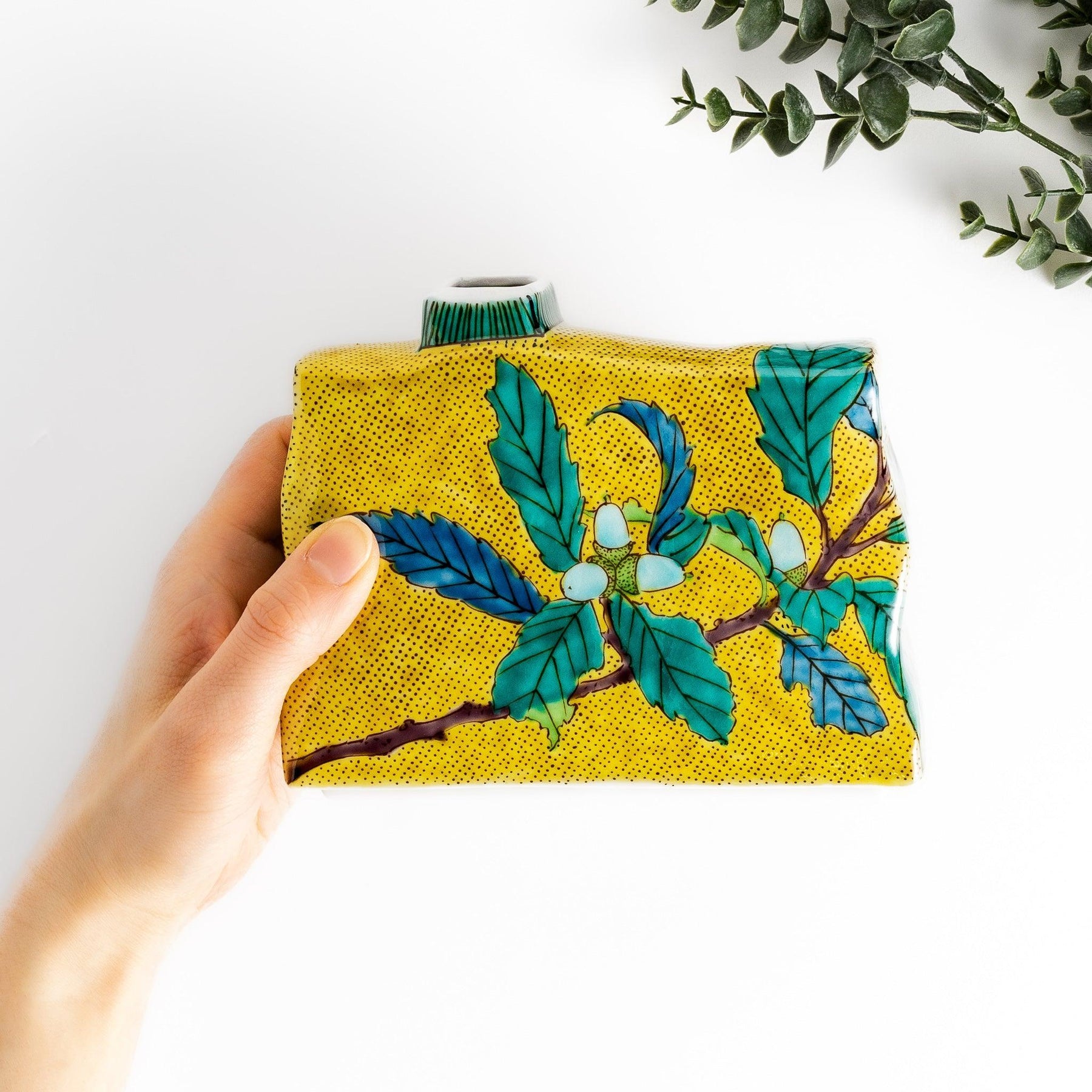 Crafted in the tradition of Kutani ware, the vase showcases meticulous overglaze painting, a hallmark of this celebrated style. Each stroke captures both precision and vitality, creating a sense of depth as if the leaves are swaying gently in the breeze. The artistry transforms a simple bud vase into a piece that carries both function and beauty.