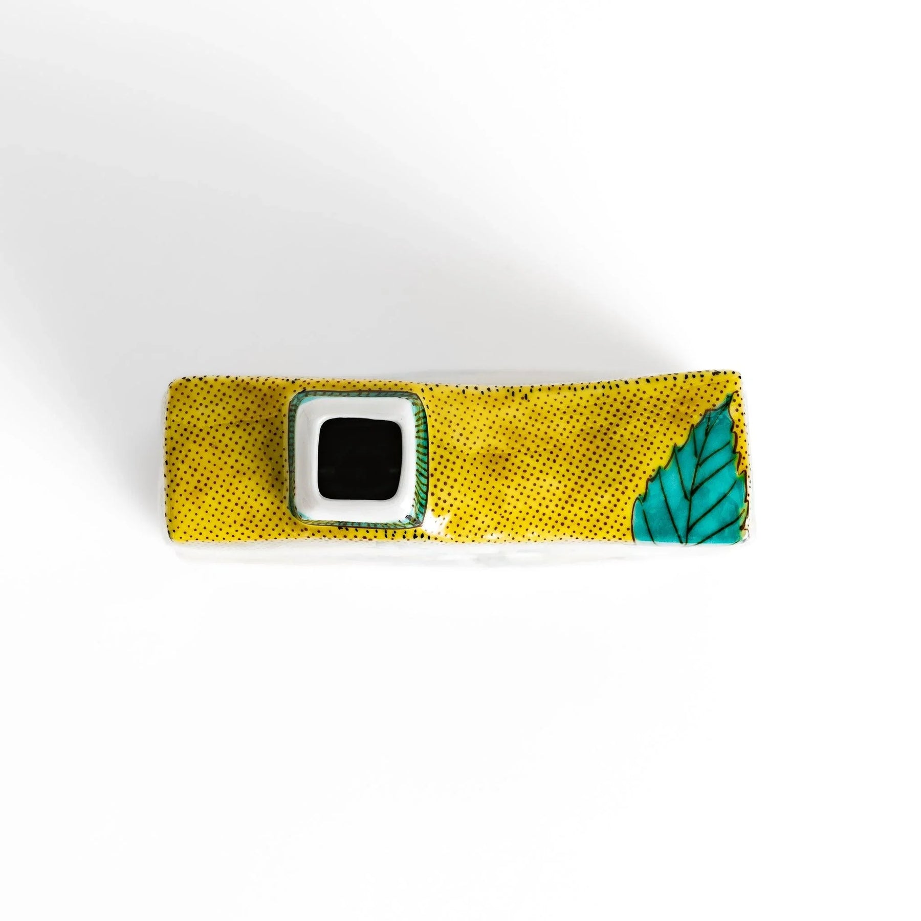A burst of color for any setting, the Yellow Fruit Bud Vase brings the brightness of nature indoors. Its golden yellow backdrop, dotted with fine black speckles, glows with warmth and energy. Across the surface, branches with turquoise and deep blue leaves stretch gracefully, accented by ripening fruit that seem almost alive with movement.