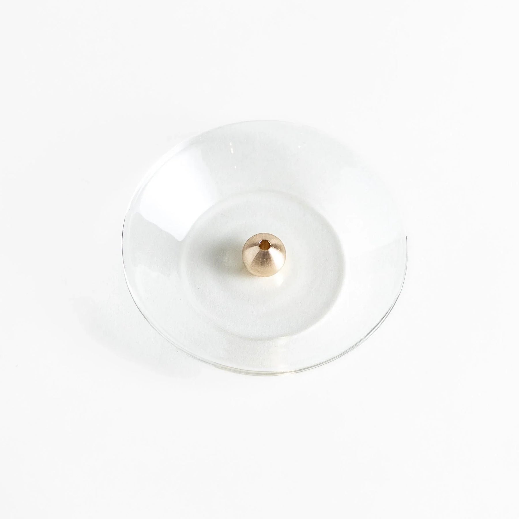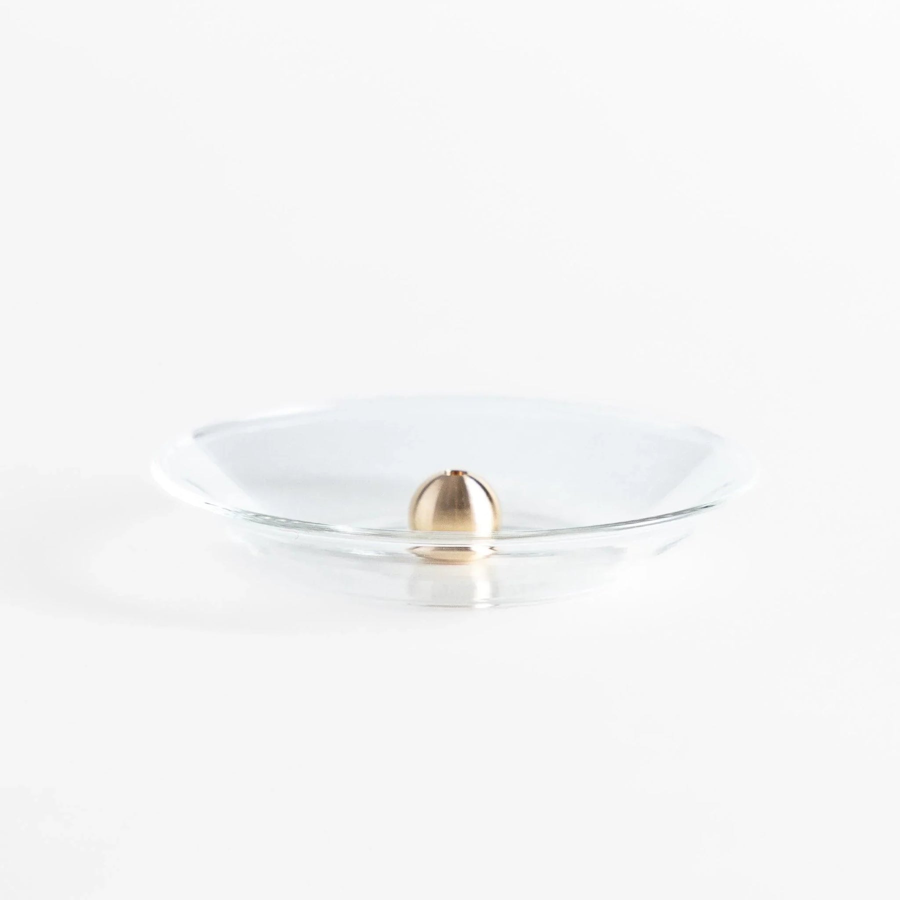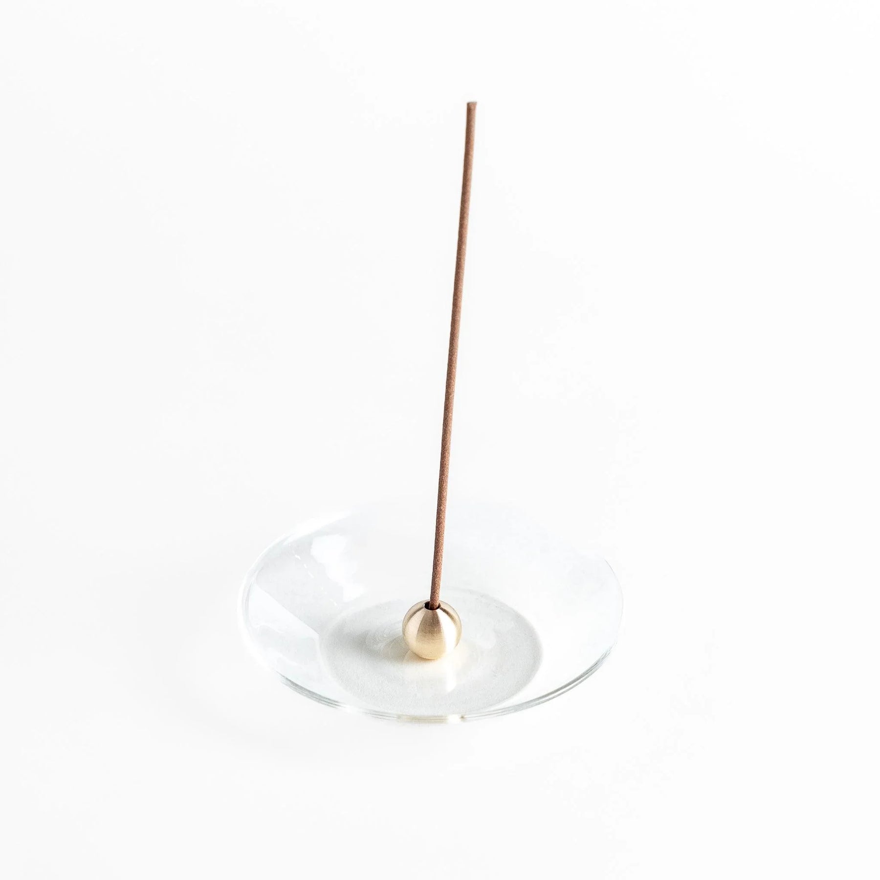 The Brass Sphere Incense Holder Set pairs simplicity with elegance. At its center sits a smooth brass sphere, designed to hold incense sticks upright with a refined presence. Beneath it, a clear glass plate gently catches falling ash, making cleanup effortless while allowing the warm glow of brass to stand out.