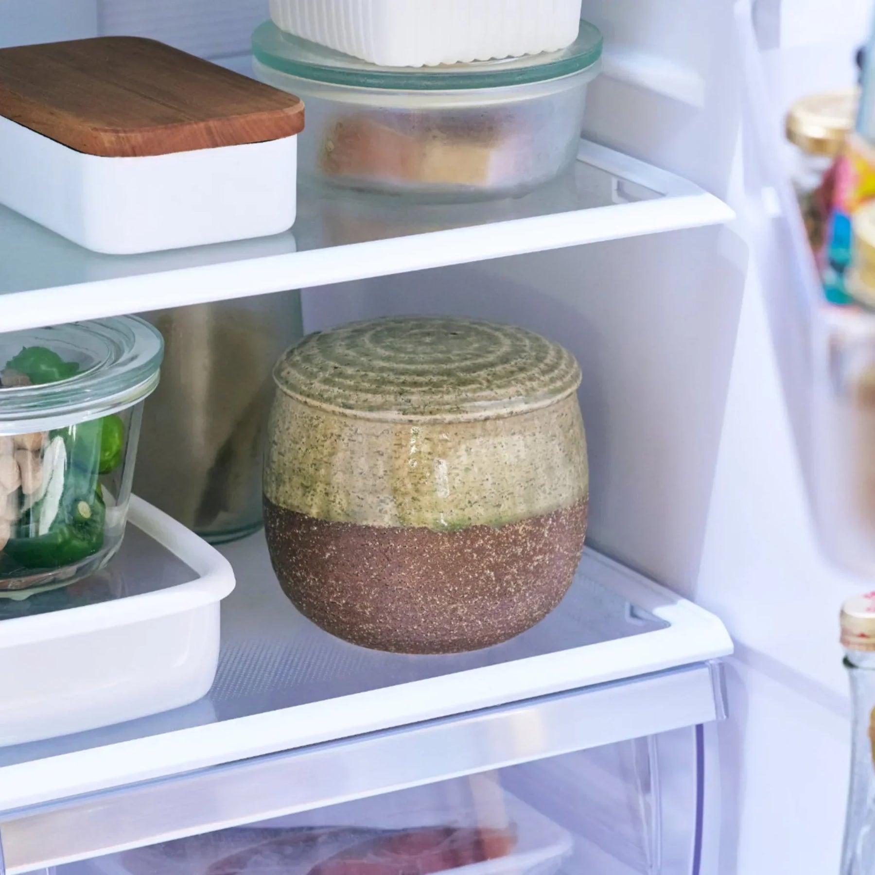 Enjoy the taste of just-cooked rice anytime. The Two-Tone Ceramic Rice Storage Bowl (Ohitsu) is crafted in Iga ware, a Japanese pottery style admired for its strength and heat retention. The mineral rich clay body provides natural insulation, while the flowing two-tone glaze adds rustic elegance to the table. Thick ceramic walls and a fitted lid help maintain steam, keeping grains light, separate, and tender.
