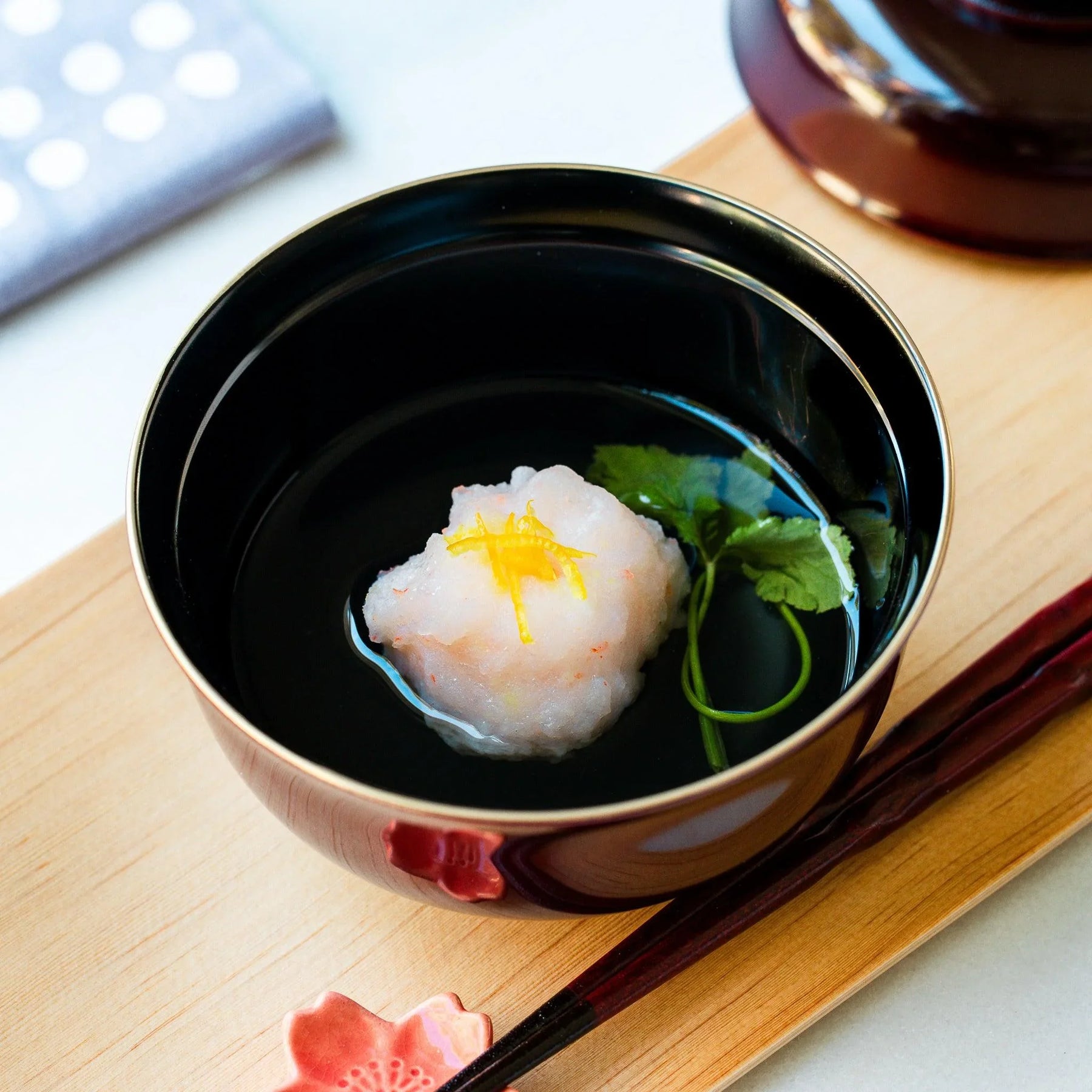 The fitted lid helps preserve warmth and aroma, keeping soup at its best until the moment it is served. This thoughtful detail reflects the harmony of form and function that defines fine lacquerware. Perfect for miso soup or seasonal specialties, the bowl enriches both everyday meals and celebratory occasions, bringing cultural depth and timeless craftsmanship to the dining experience.