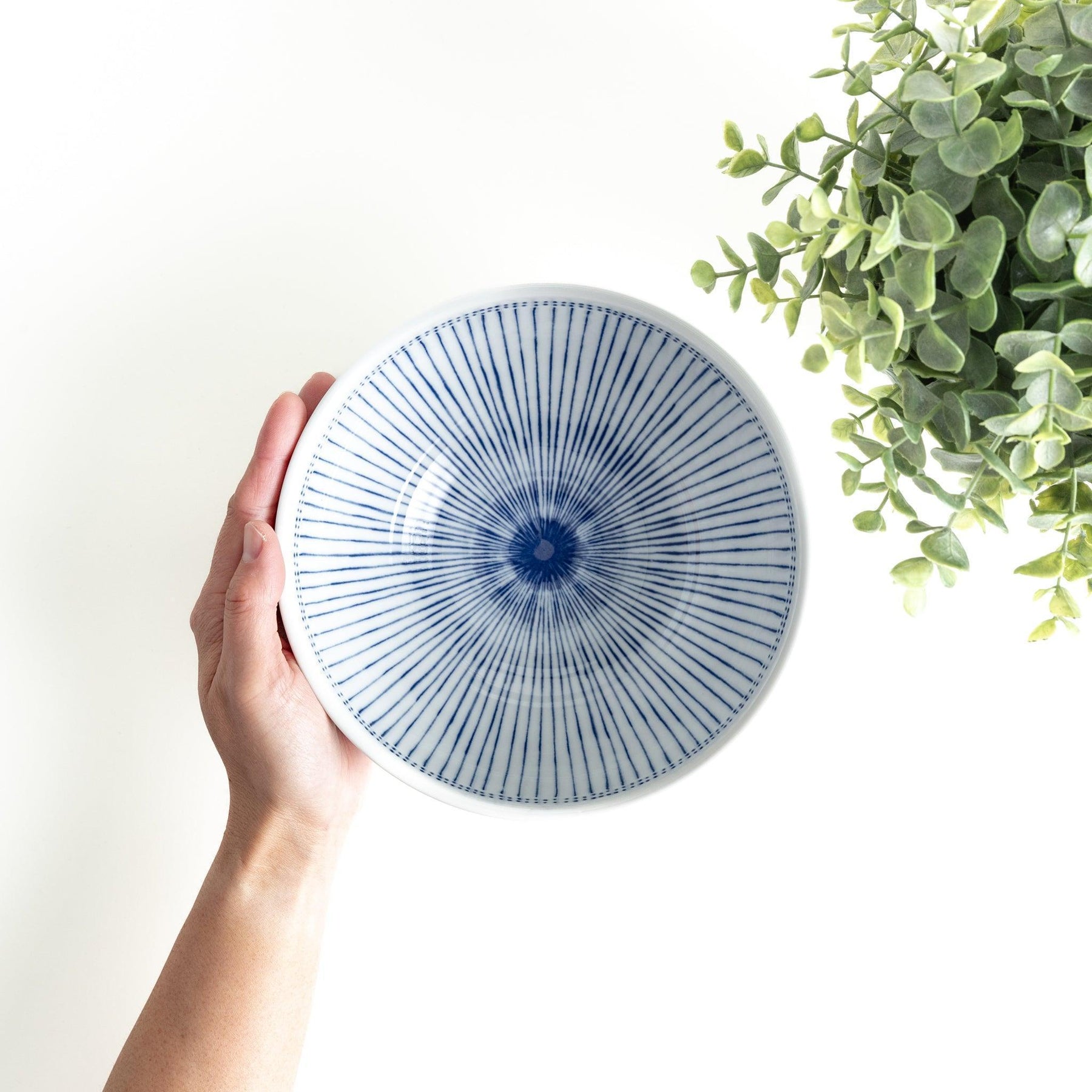 The Dotted Stripe Donburi Bowl features a refined take on the classic tokusa pattern, traditionally used to symbolize growth and prosperity. Fine indigo lines radiate outward from the center, accented by a neat row of hand-applied dots that add rhythm and charm to the design. The crisp blue and white contrast brings timeless elegance to this Mino ware porcelain bowl.