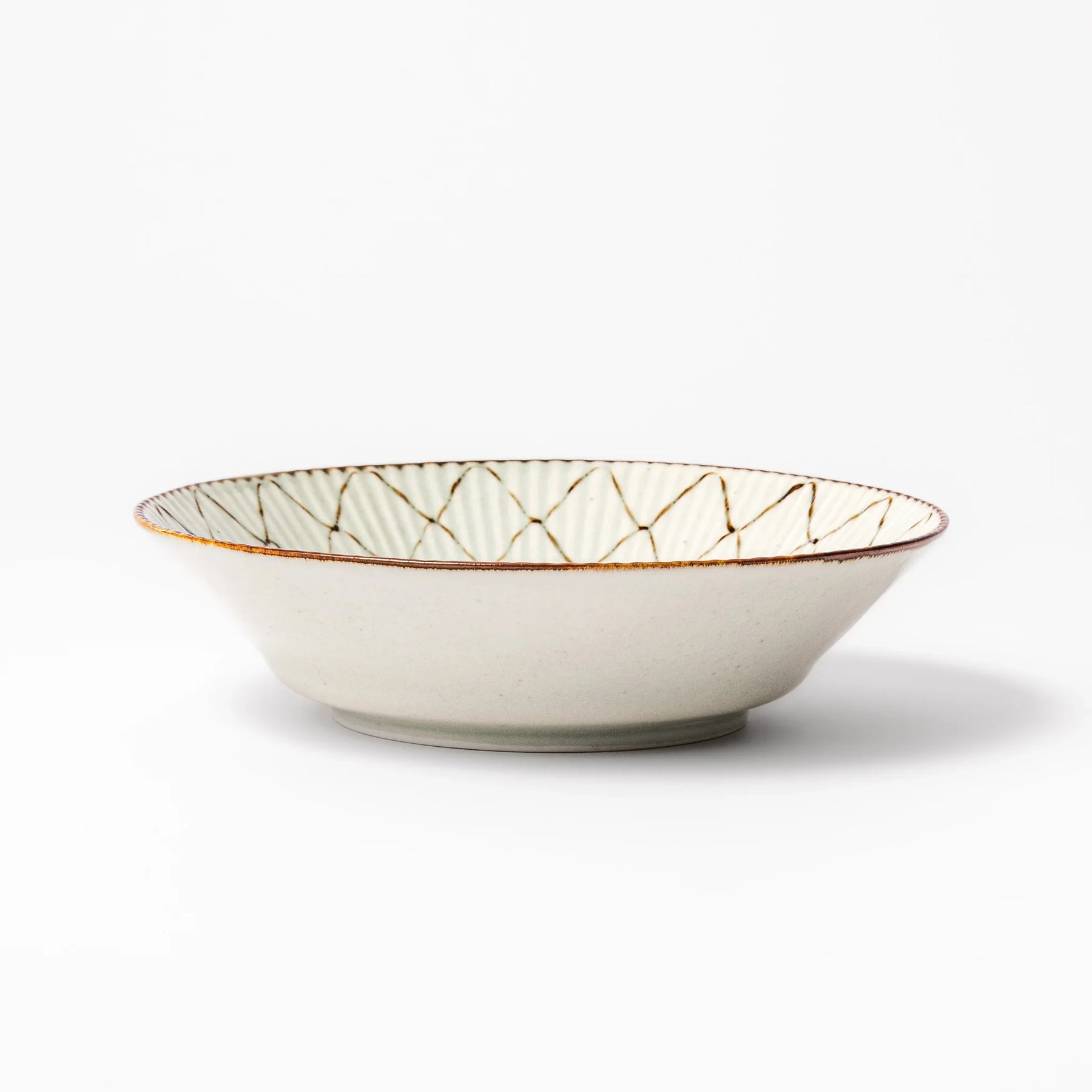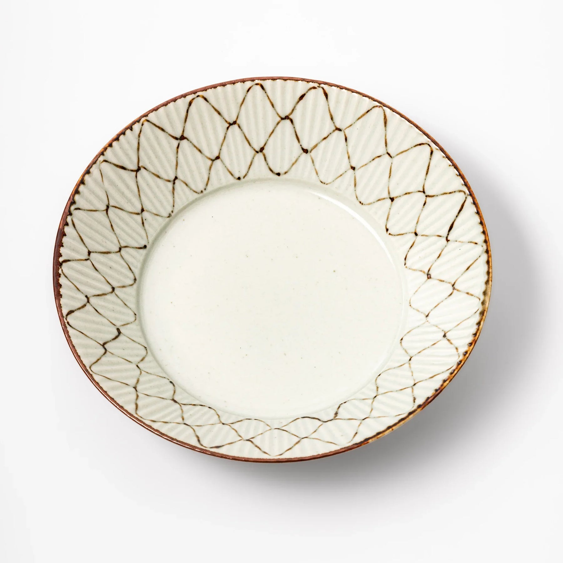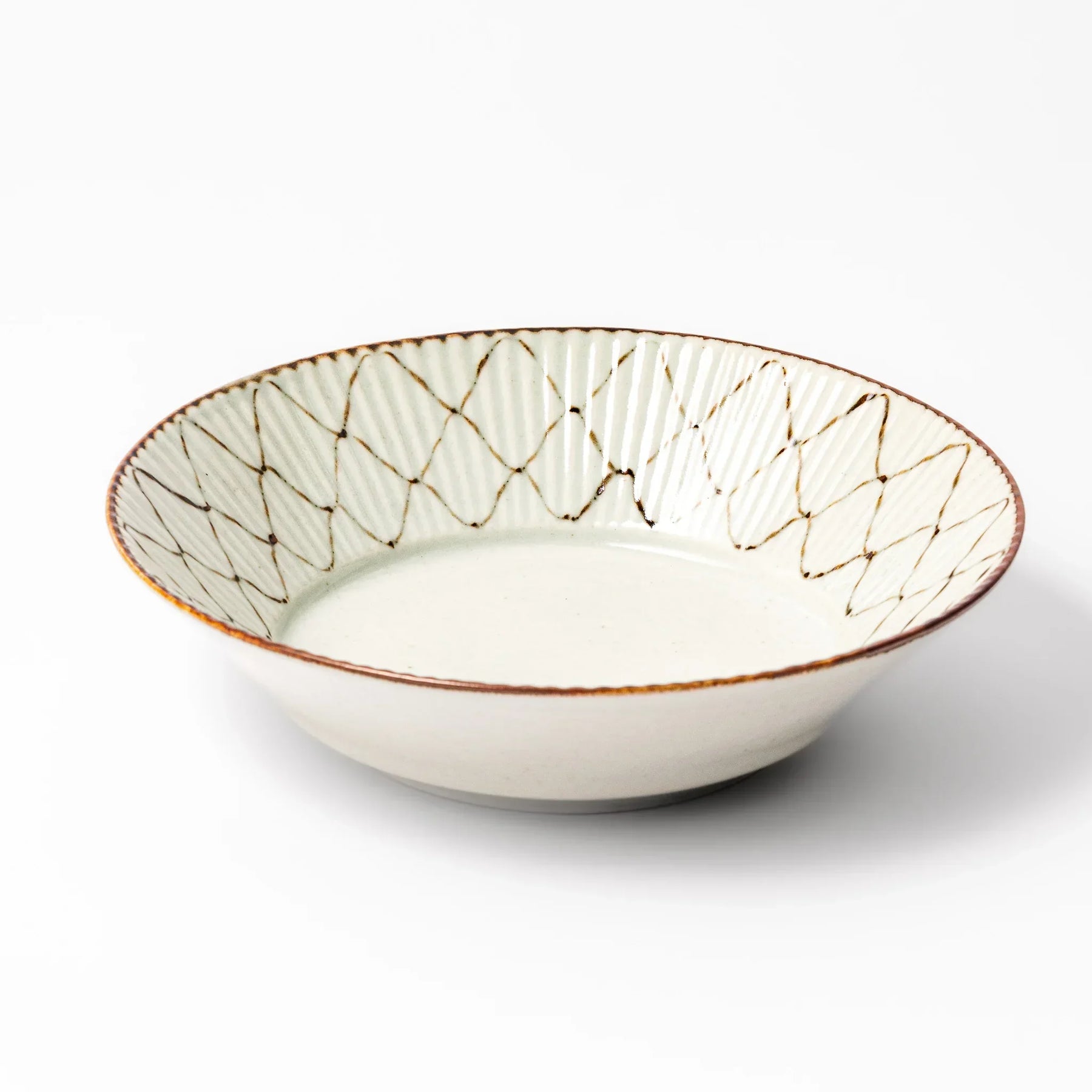 Serve your favorite dishes with understated elegance using the Rustic Diamond Weave Pasta Bowl, a large handmade Japanese ceramic bowl designed for pasta, curry, soups, or plated entrées. Its broad rim is fluted and hand-painted with a vintage-inspired diamond weave motif in earthy brown, framing the food with warmth and subtle detail.