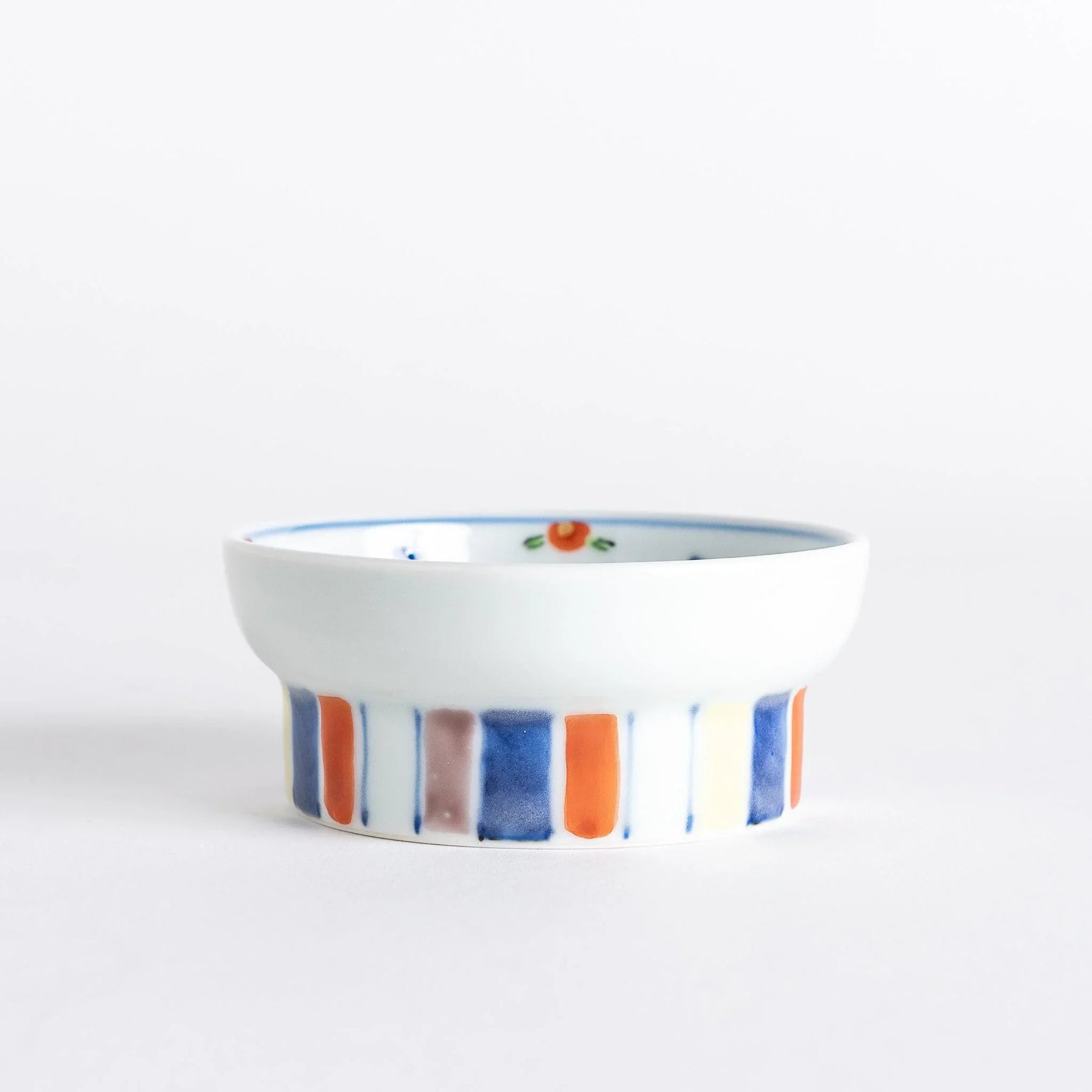 Delicate and captivating, the Butterfly Raised Sauce Dish highlights the artistry of traditional Arita Ware. The elevated pedestal base adds a sense of refinement, while the vibrant hand-painted design features butterflies surrounded by floral motifs in shades of blue, red, and soft green. The striped pattern on the base provides a lively contrast, giving the dish both charm and sophistication.