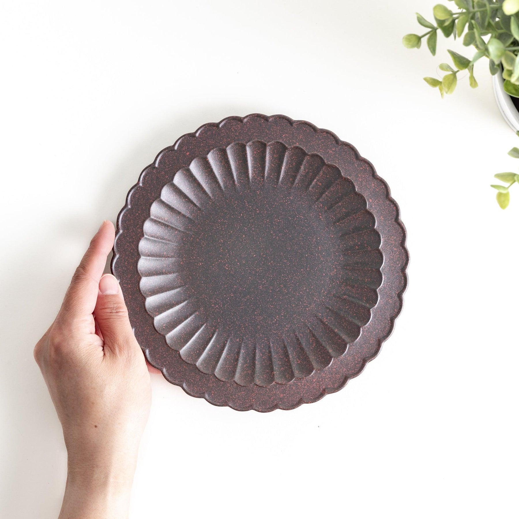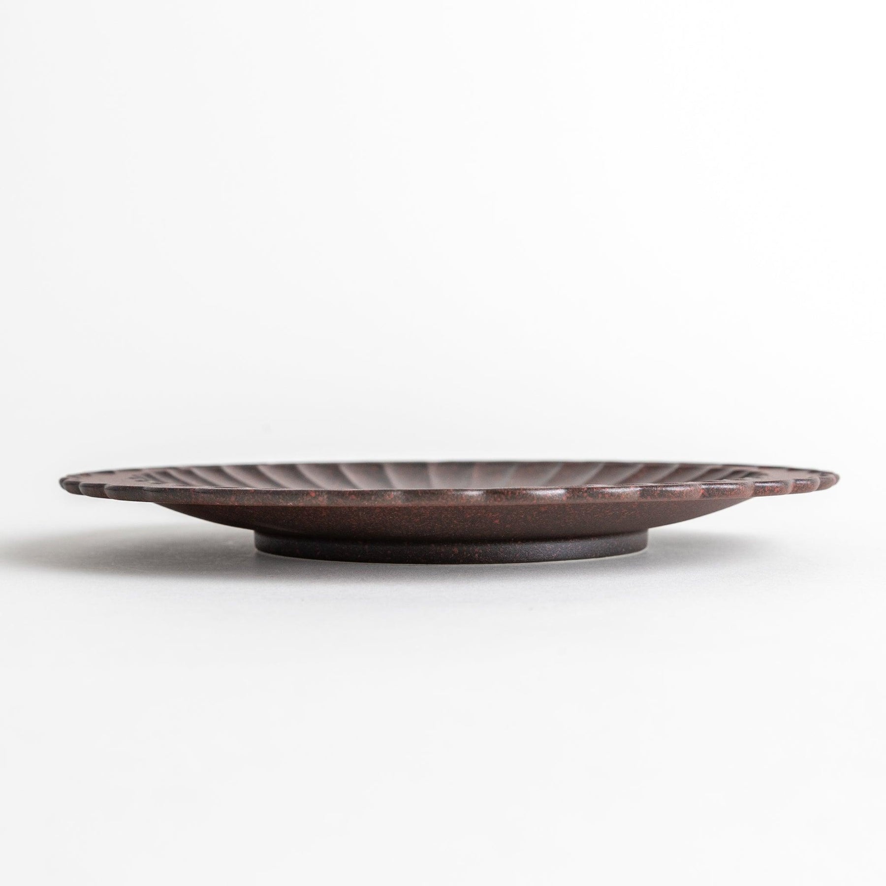 Dark brown ceramic plate with a scalloped rim and radial textured pattern on a light background.