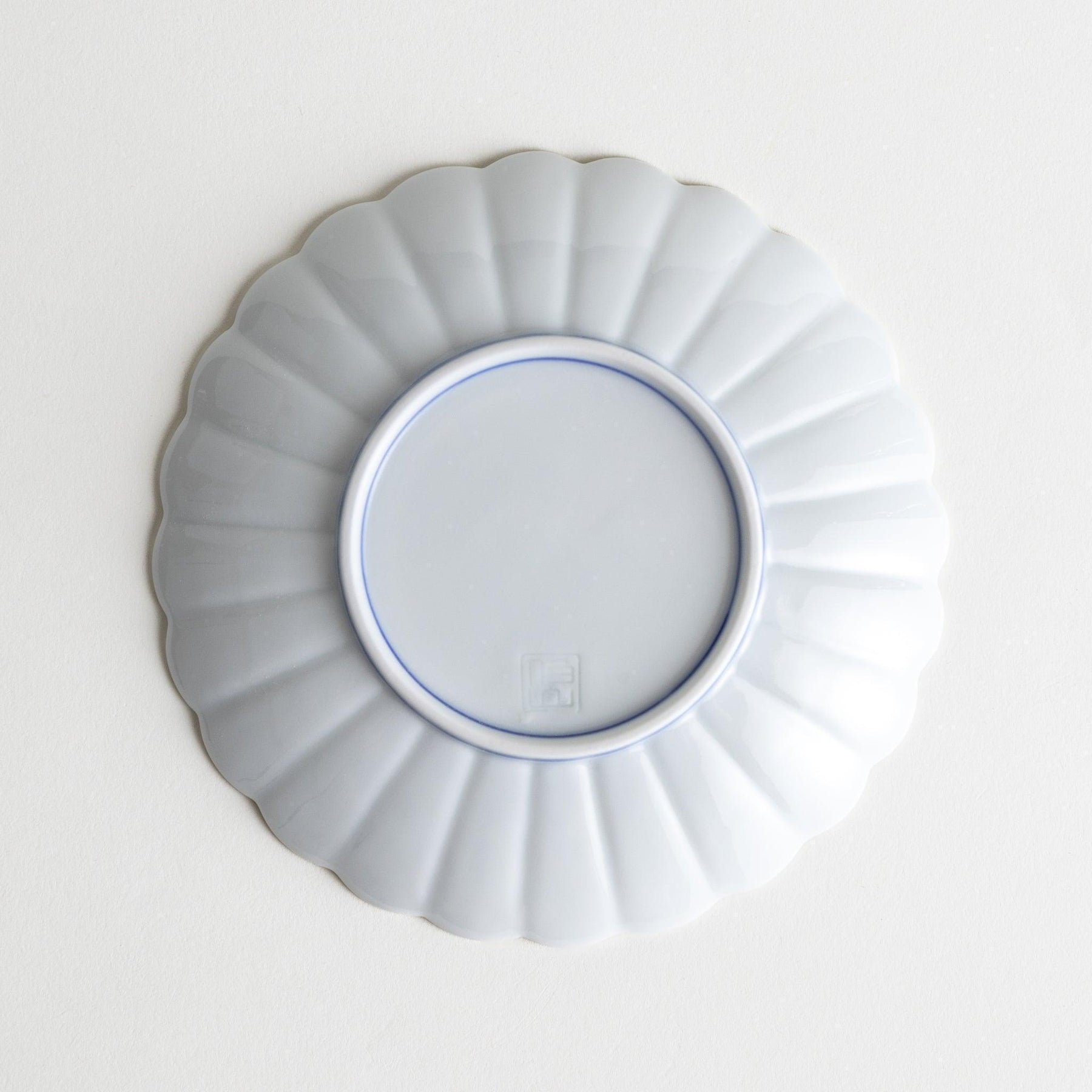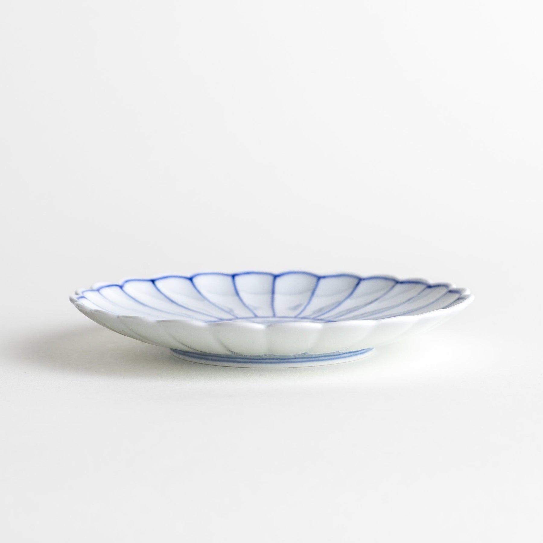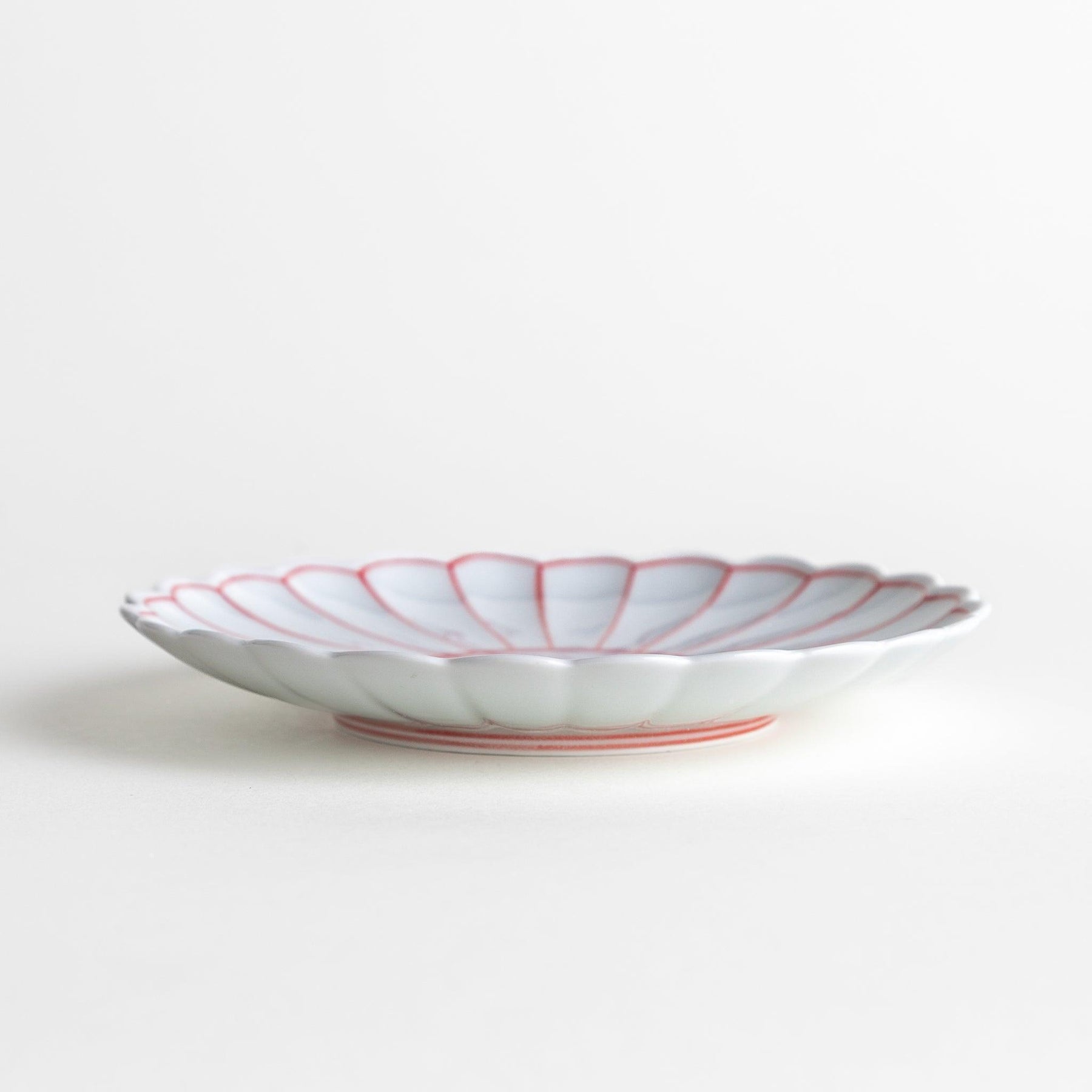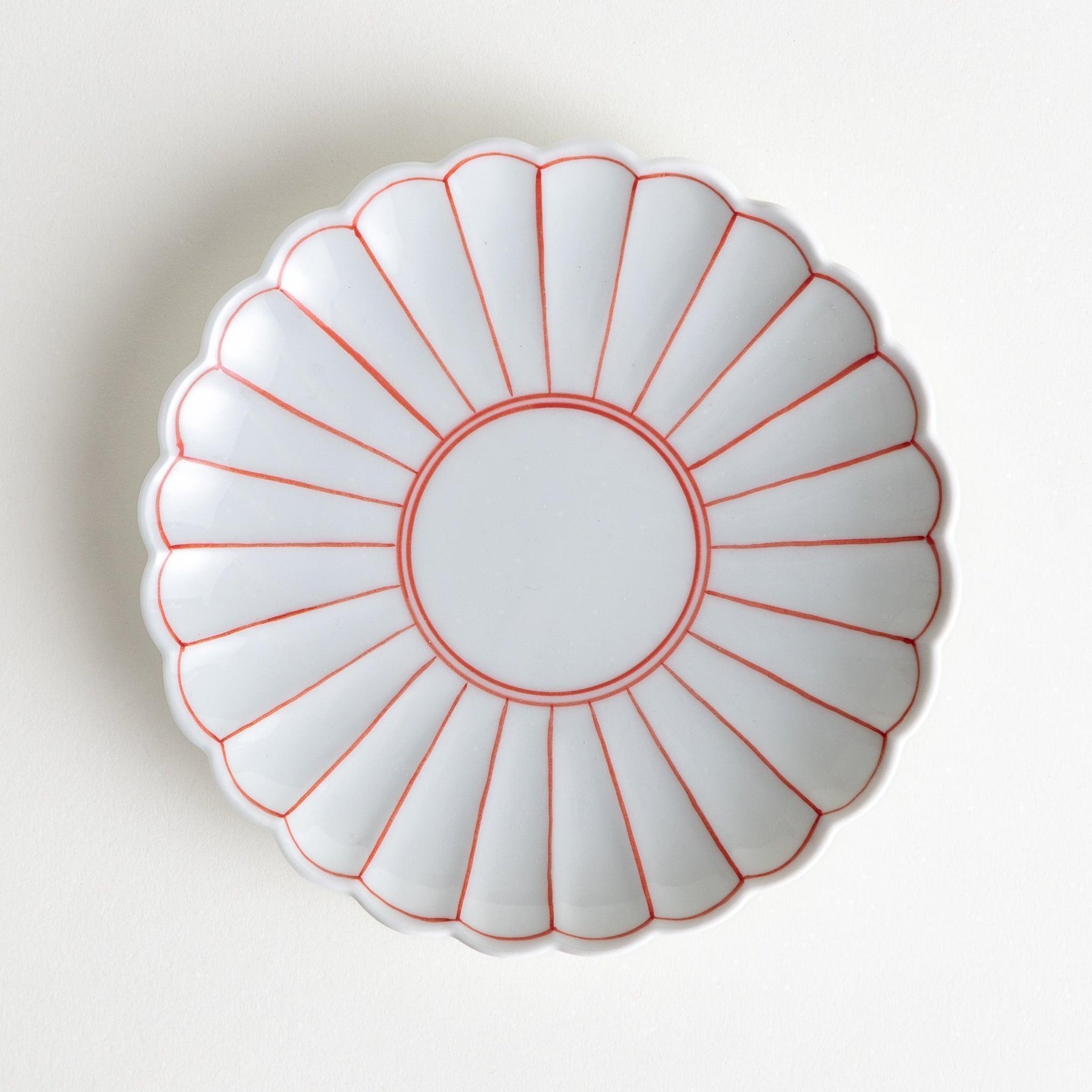 The Chrysanthemum Lined Salad Plate is a graceful piece of Arita ware from Ojiyama Kiln, featuring a scalloped edge that radiates like the petals of a chrysanthemum. Each plate is hand-painted with fine sometsuke-style lines in either deep indigo or vibrant red, creating a crisp contrast against the pure white porcelain surface. A transparent glaze enhances the smooth finish and gives the design a timeless elegance.