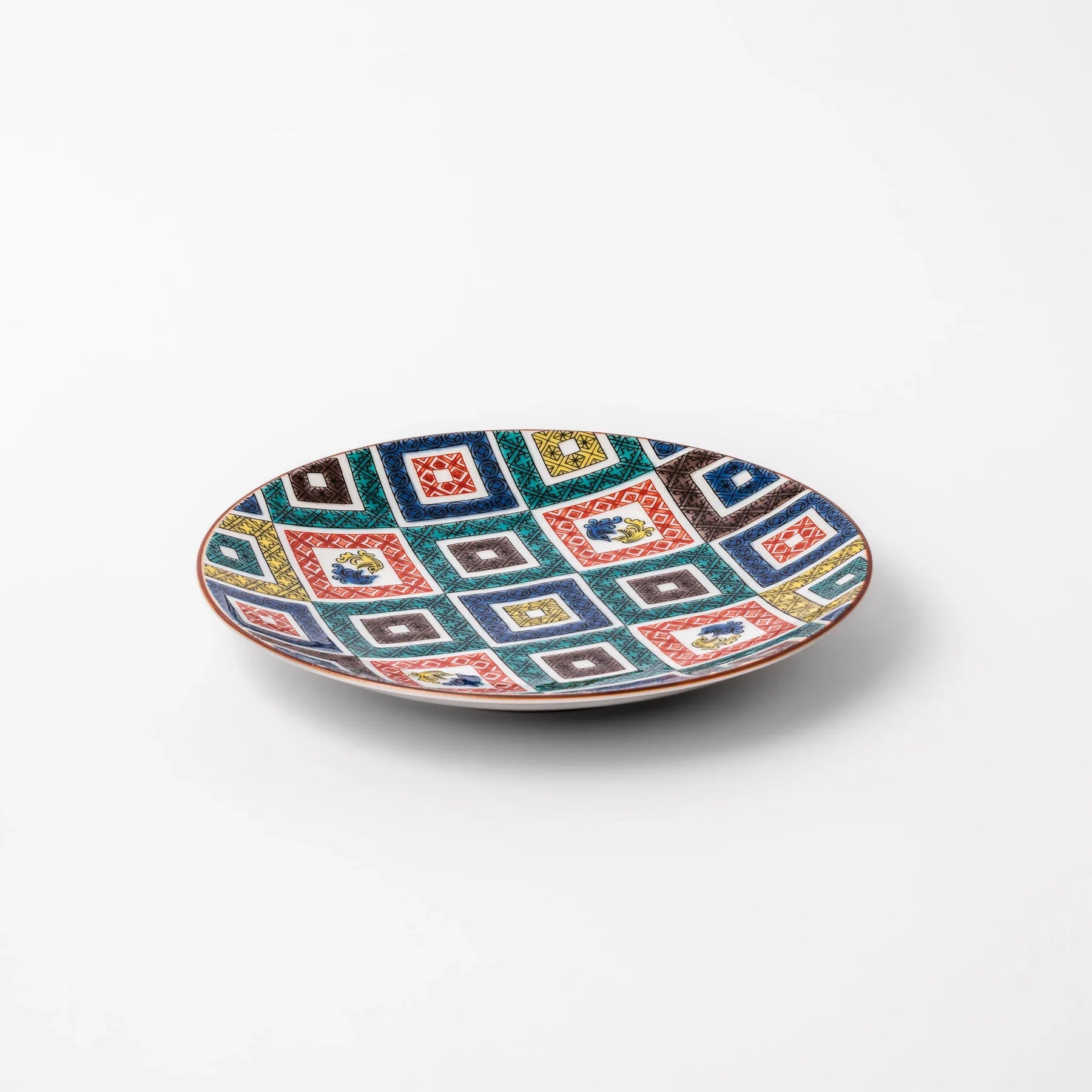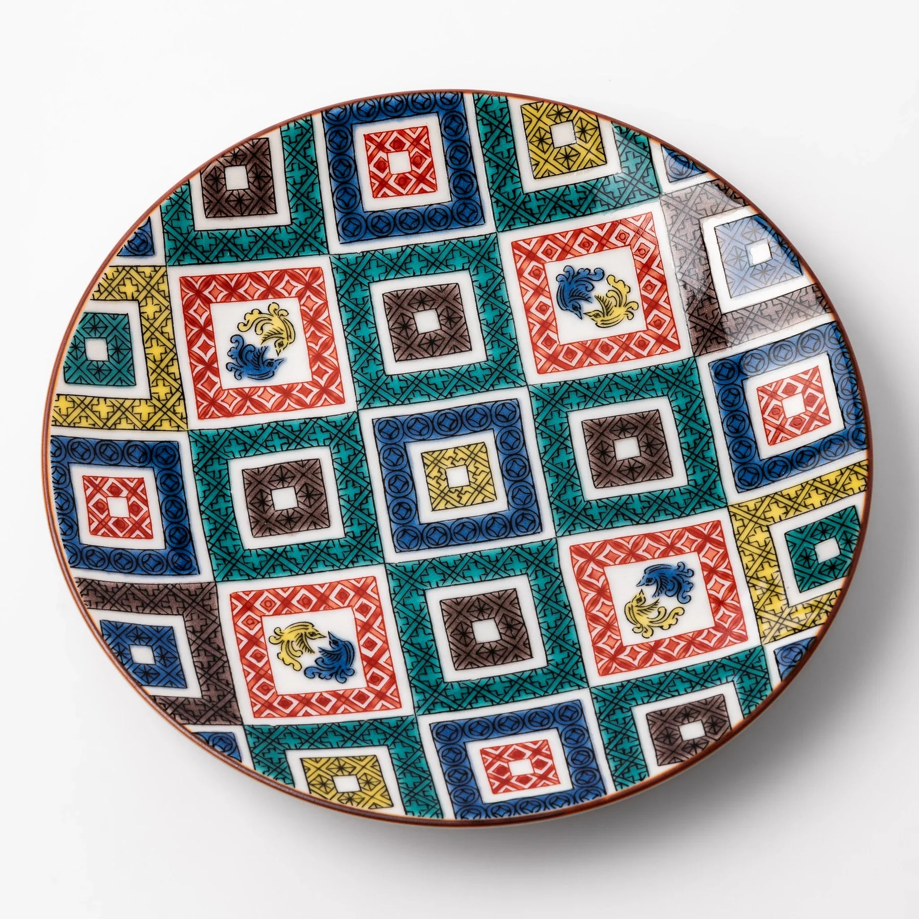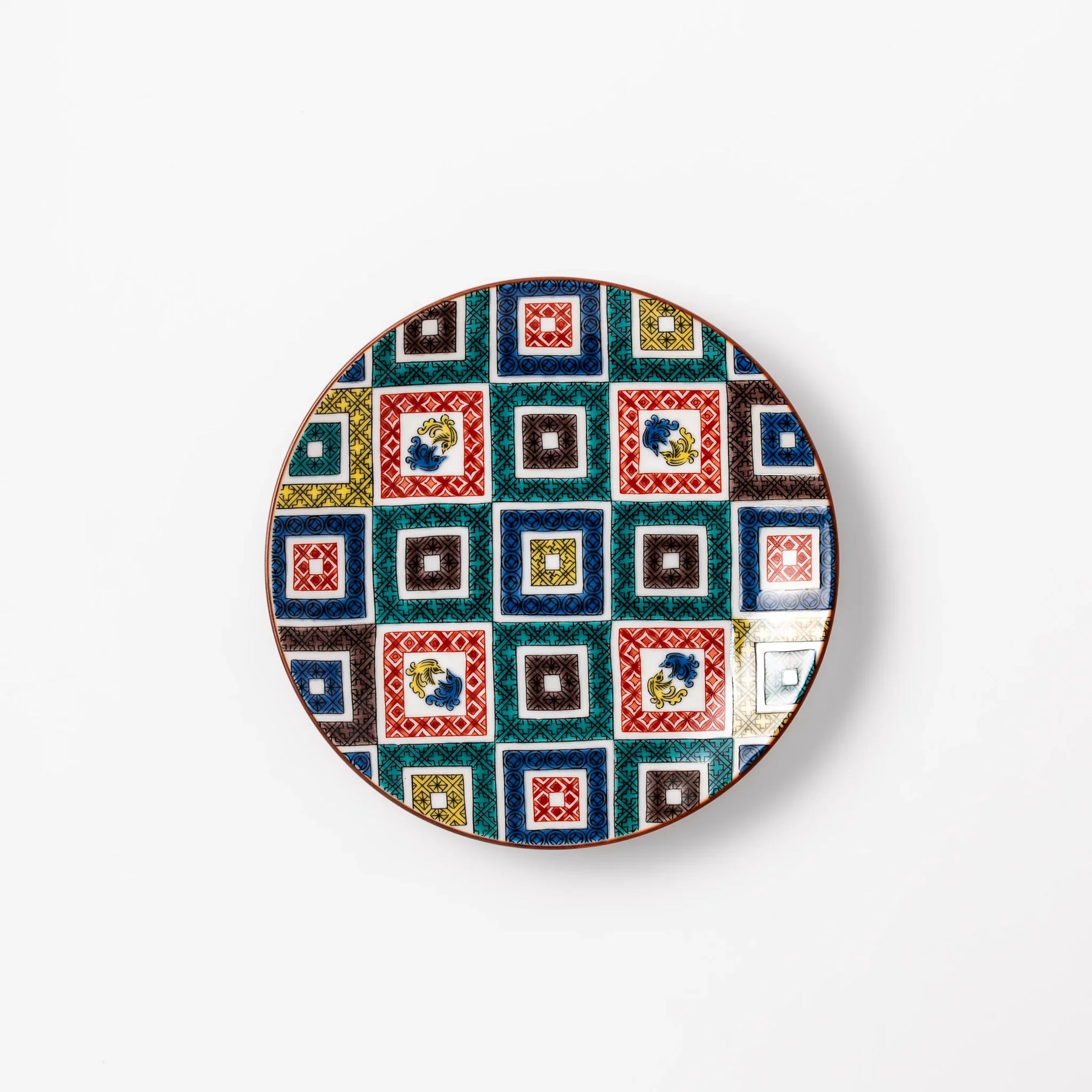 Bright, bold, and richly detailed, the Cobblestone Mosaic Dessert Plate brings centuries of Japanese ceramic artistry to your table. Inspired by Ko-Kutani ware, this dessert plate features a vivid cobblestone-style grid of colorful squares—each intricately painted with traditional overglaze enamels in red, blue, green, yellow, and black.