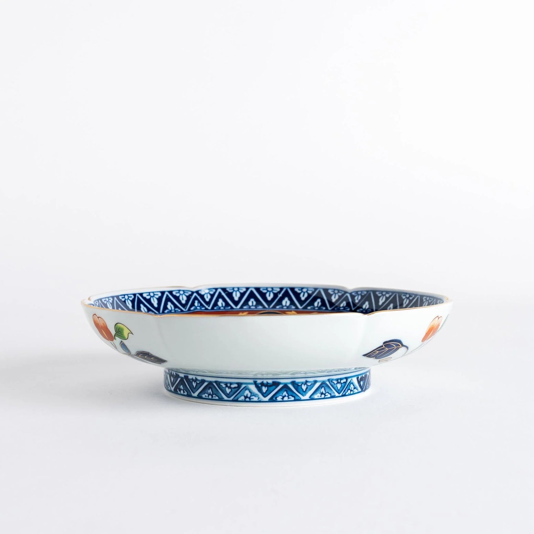 The Gold Floral Salad Plate by Shobido Honten is a fine example of Arita ware, showcasing the opulence of Ko-Imari style. Its design features vibrant peonies and chrysanthemums framed by a gold ring over an indigo diamond border. Each detail is brought to life using the somenishiki technique, a traditional Japanese method that layers intricate hand-painted patterns in vivid colors. This combination of floral motifs, geometric accents, and delicate gold detailing creates a striking balance of elegance and richness.