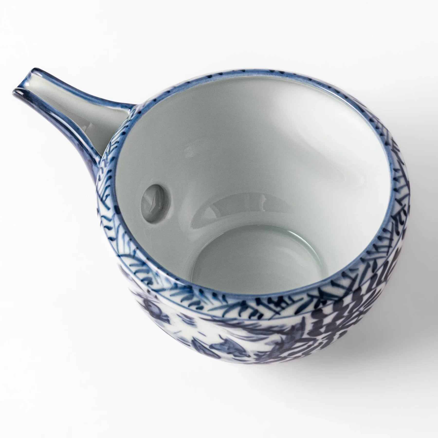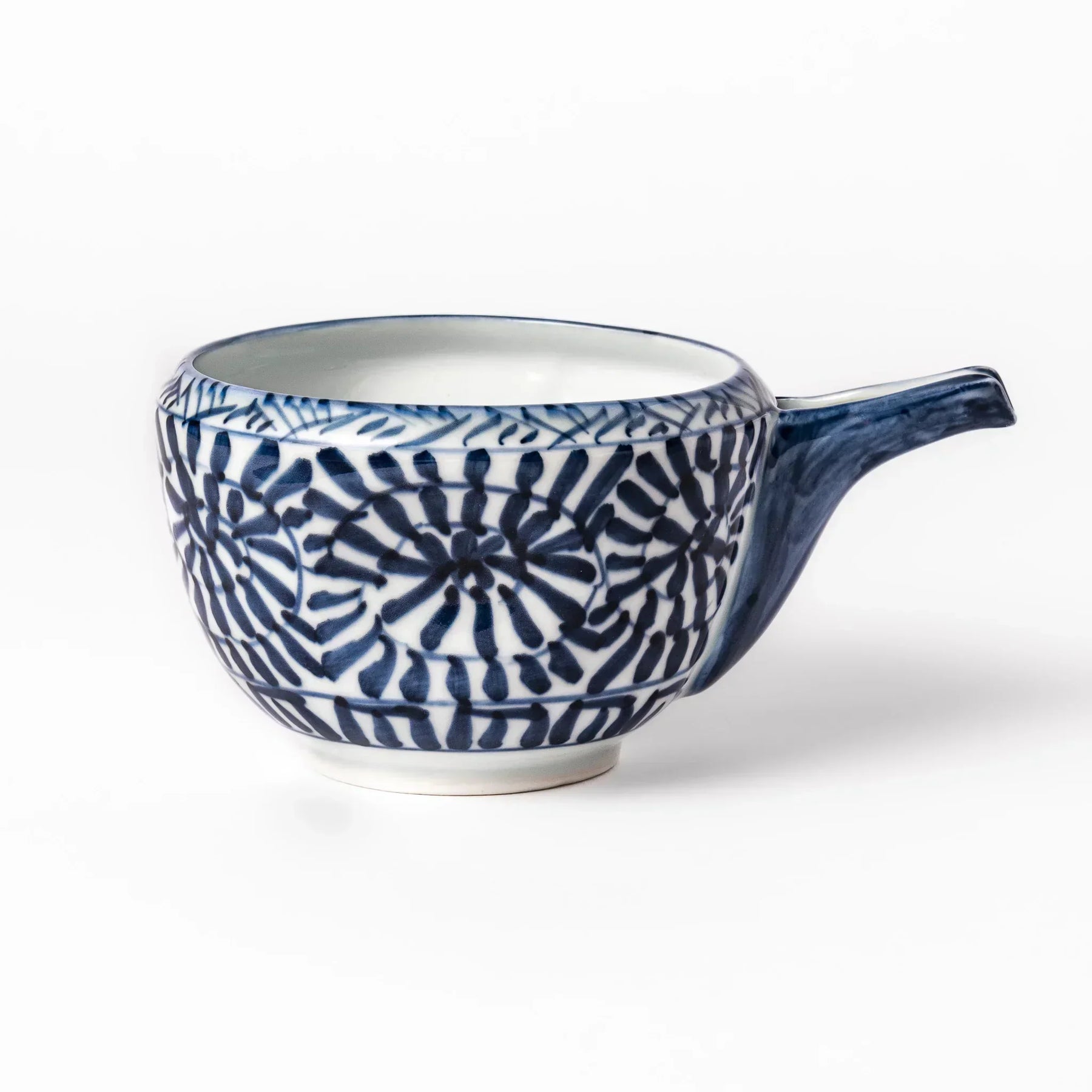 The Arabesque Landscape Sake Pourer reflects the timeless beauty of Hasami Ware, admired for its graceful simplicity and artistry. Hand-painted in rich indigo, the porcelain body features flowing arabesque motifs framing a tranquil landscape, recalling the refined elegance of Edo-period tableware.