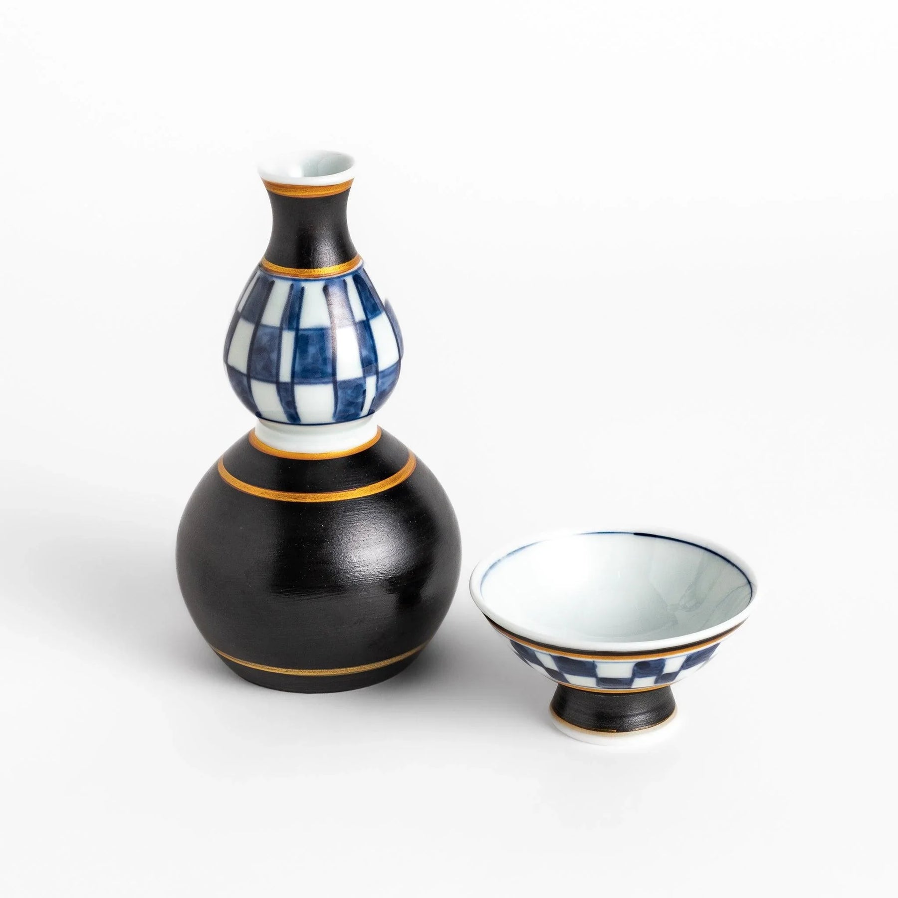 The Black Checked Sake Cup combines timeless tradition with a bold, modern edge. Its indigo checkered pattern is hand-painted with refined brushwork by skilled Hasami artisans. Framed with subtle gold lines and set on a deep black pedestal base, the design carries both contrast and harmony, giving the cup a distinctive presence.