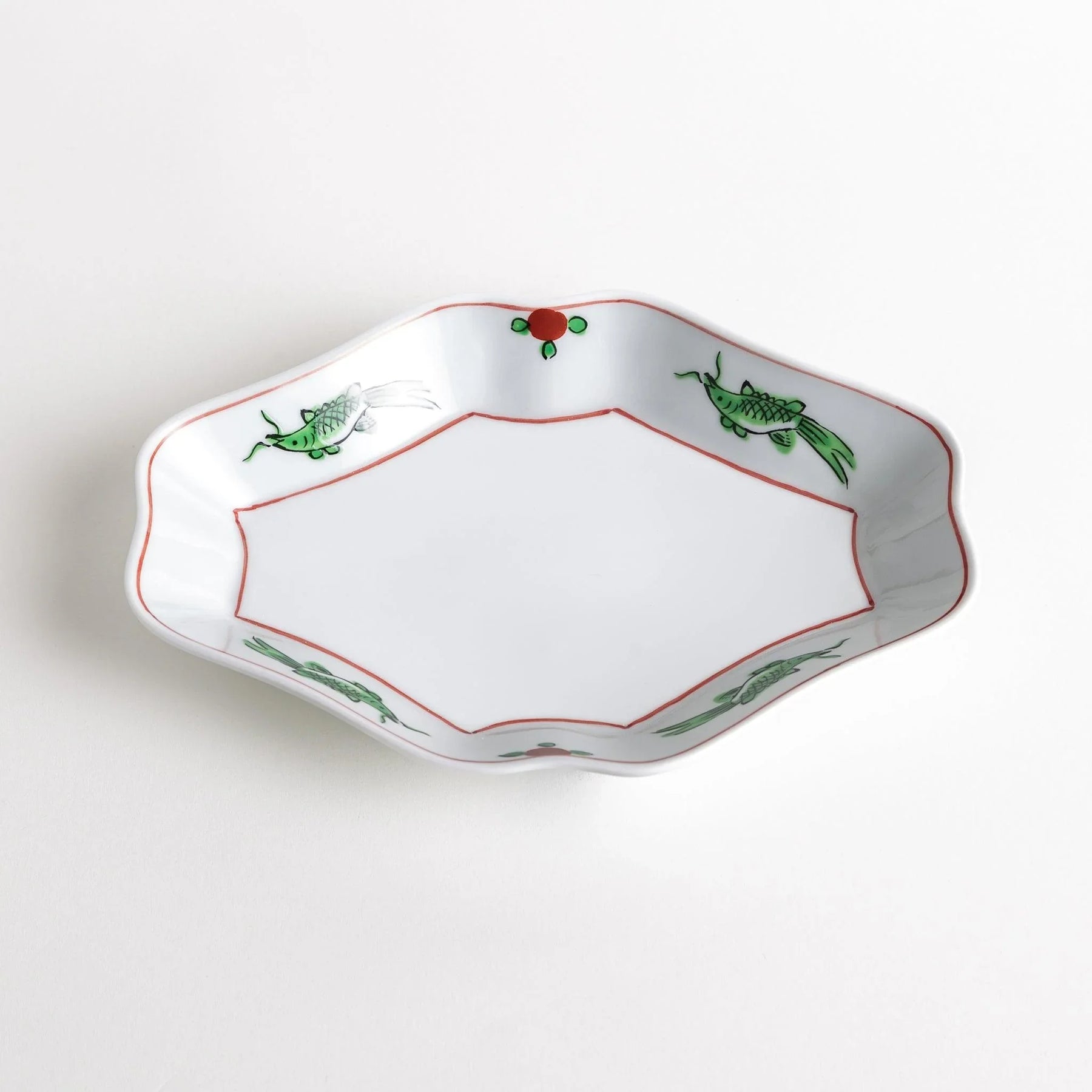 The Classic Fish and Wave-Edged Salad Plate blends playful detail with elegant form, showcasing the charm of Hasami ware craftsmanship. Hand-painted fish swim across the rim in a traditional green-and-red palette, each one slightly different in expression and pose. These whimsical motifs are framed by a red-lined octagonal center and gentle, fluted edges that create a soft, wave-like silhouette.