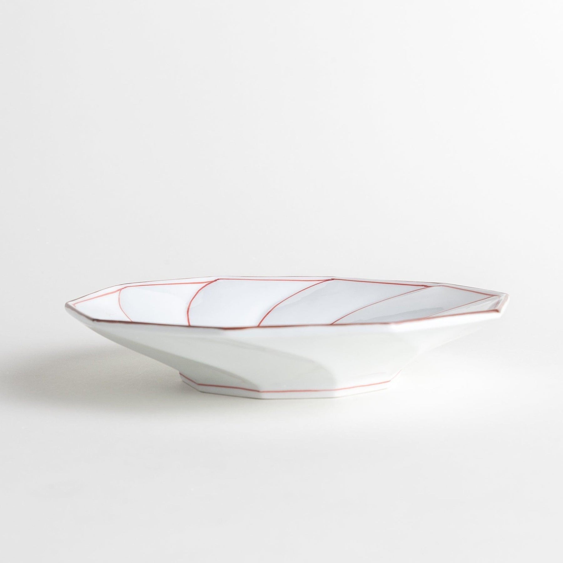 Crafted from fine Hasami ware porcelain, the plate features gently rising sides that make it suitable for both Western and Japanese meals. It’s ideal for a refreshing salad, an open sandwich, or a beautifully plated rice dish. Available in two colors, the soft white porcelain is outlined in hand-painted lines of navy or vermillion, adding structure without overwhelming your food presentation.