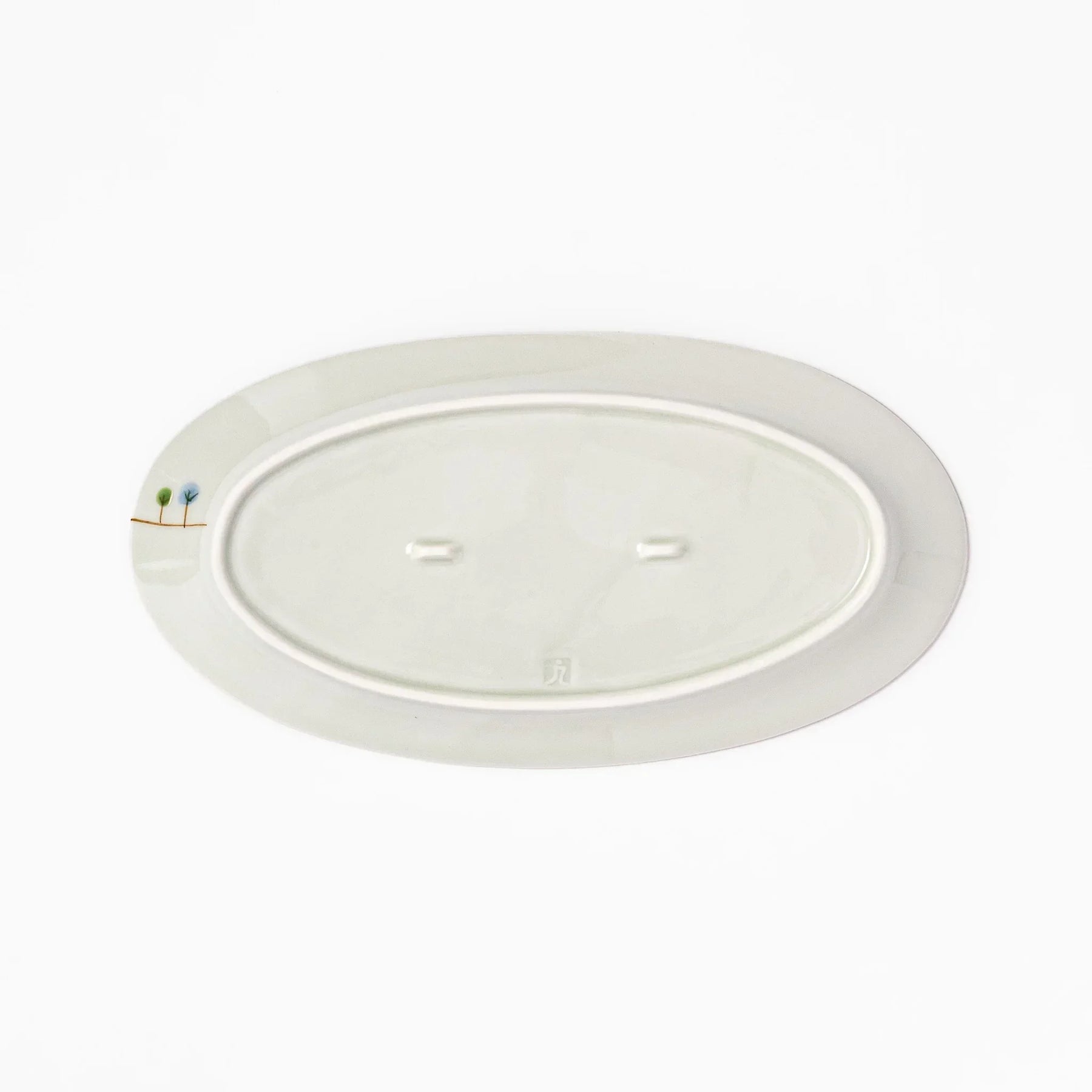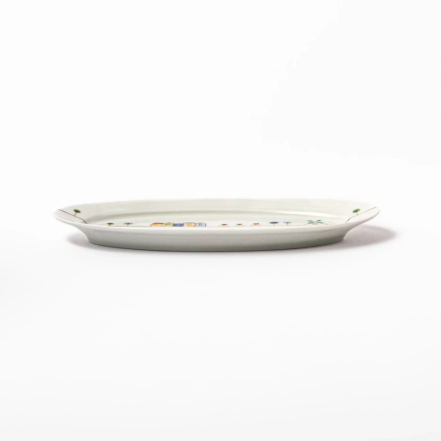 Its slim oval shape offers an easy surface for salads, open-faced sandwiches, pastries, or fruit. The smooth porcelain finish keeps the design crisp and clean, while the airy linework allows the colors to shine without overwhelming the food. Light in hand and sturdy enough for daily use, it brings a simple, welcoming charm to your table.