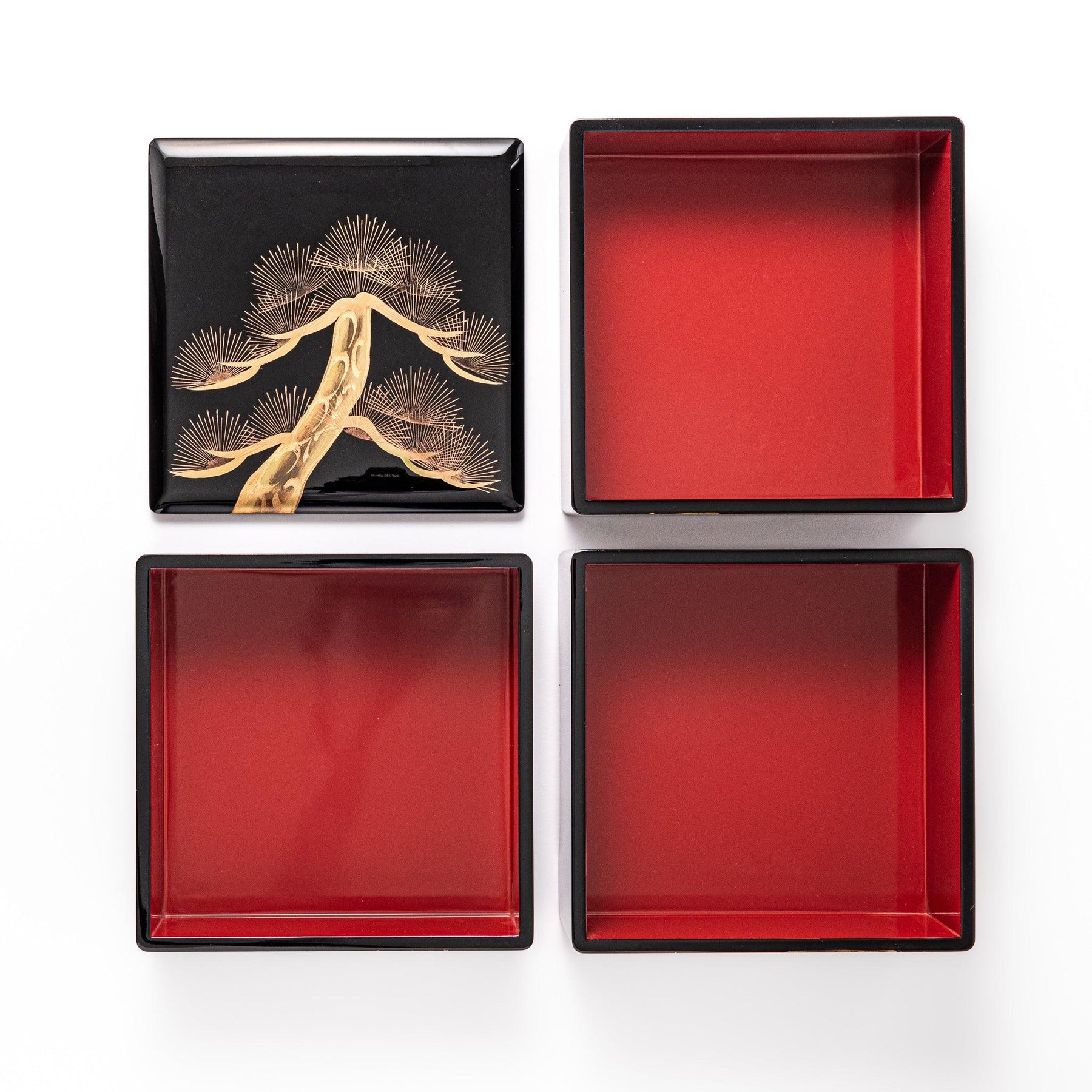 Celebrate tradition and elegance with the Golden Pine Three-Tier Japanese Jubako Box, a stunning stacking bento box handcrafted in Japan. Adorned with a radiant gold pine tree motif, this lacquered box features a glossy black surface that beautifully contrasts with the hand-painted design, symbolizing longevity, resilience, and celebration.