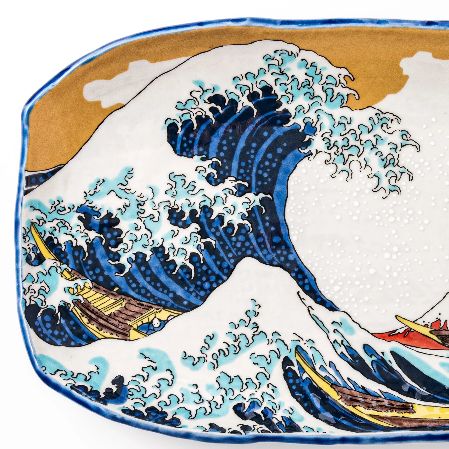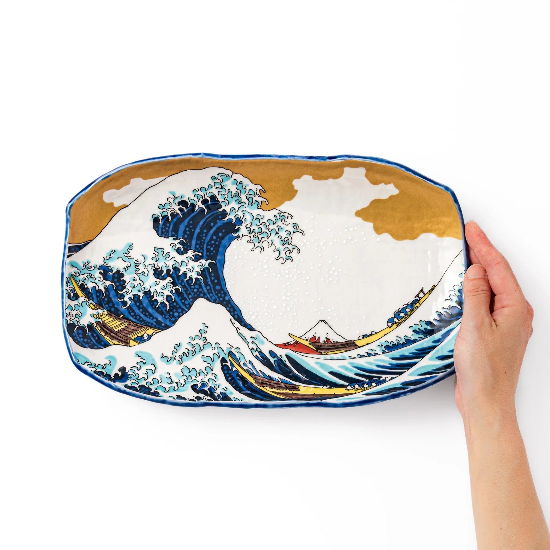 Make a bold artistic statement at the table with the Hokusai Great Wave Serving Plate, a stunning porcelain piece featuring the iconic ukiyo-e print The Great Wave off Kanagawa by Katsushika Hokusai. This dynamic design captures a towering indigo wave cresting over fishing boats, with majestic Mt. Fuji framed in the distance—all elevated by a shimmering gold-sky backdrop.