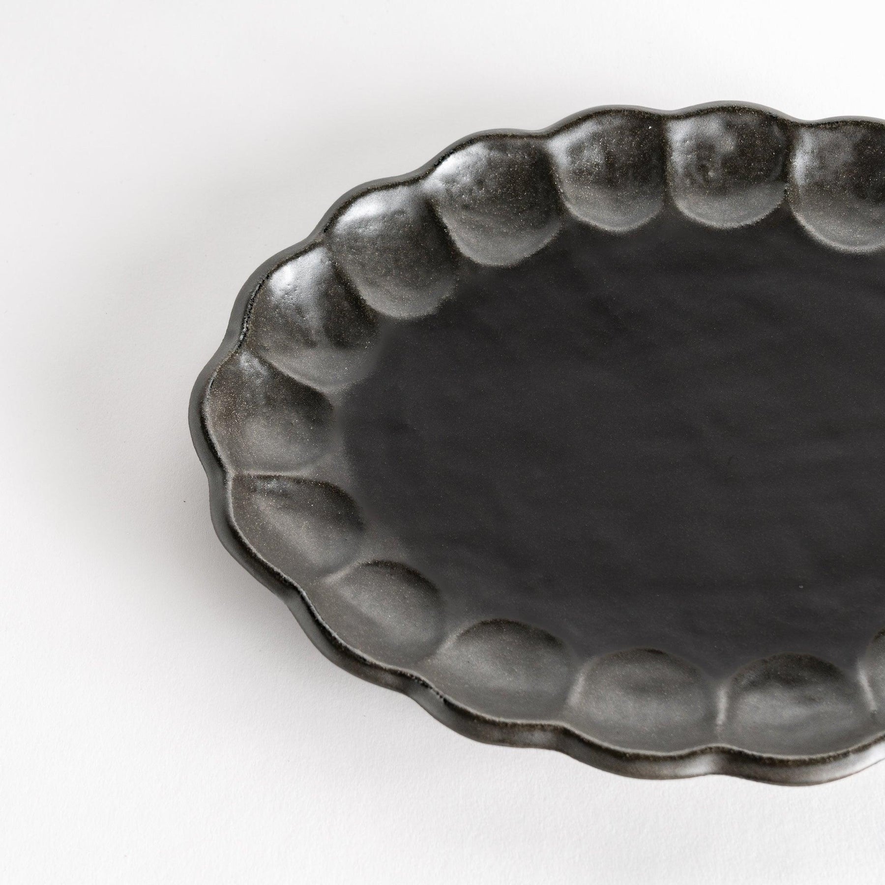 The Rinka Petal Oval Serving Plate is a refined piece of Mino Ware that blends rustic charm with timeless elegance. Its scalloped rim, shaped like soft flower petals, creates a natural frame that highlights the beauty of any dish placed within. Crafted from porcelain with a matte finish, the surface carries subtle variations in tone, giving each plate a warm, handmade character.