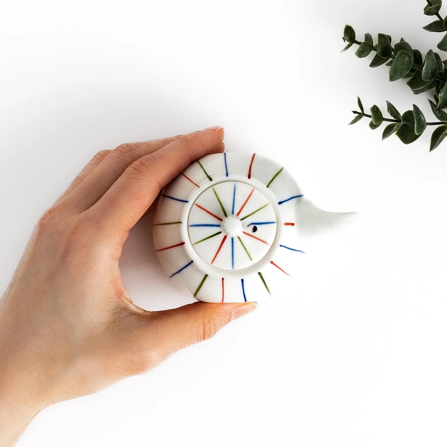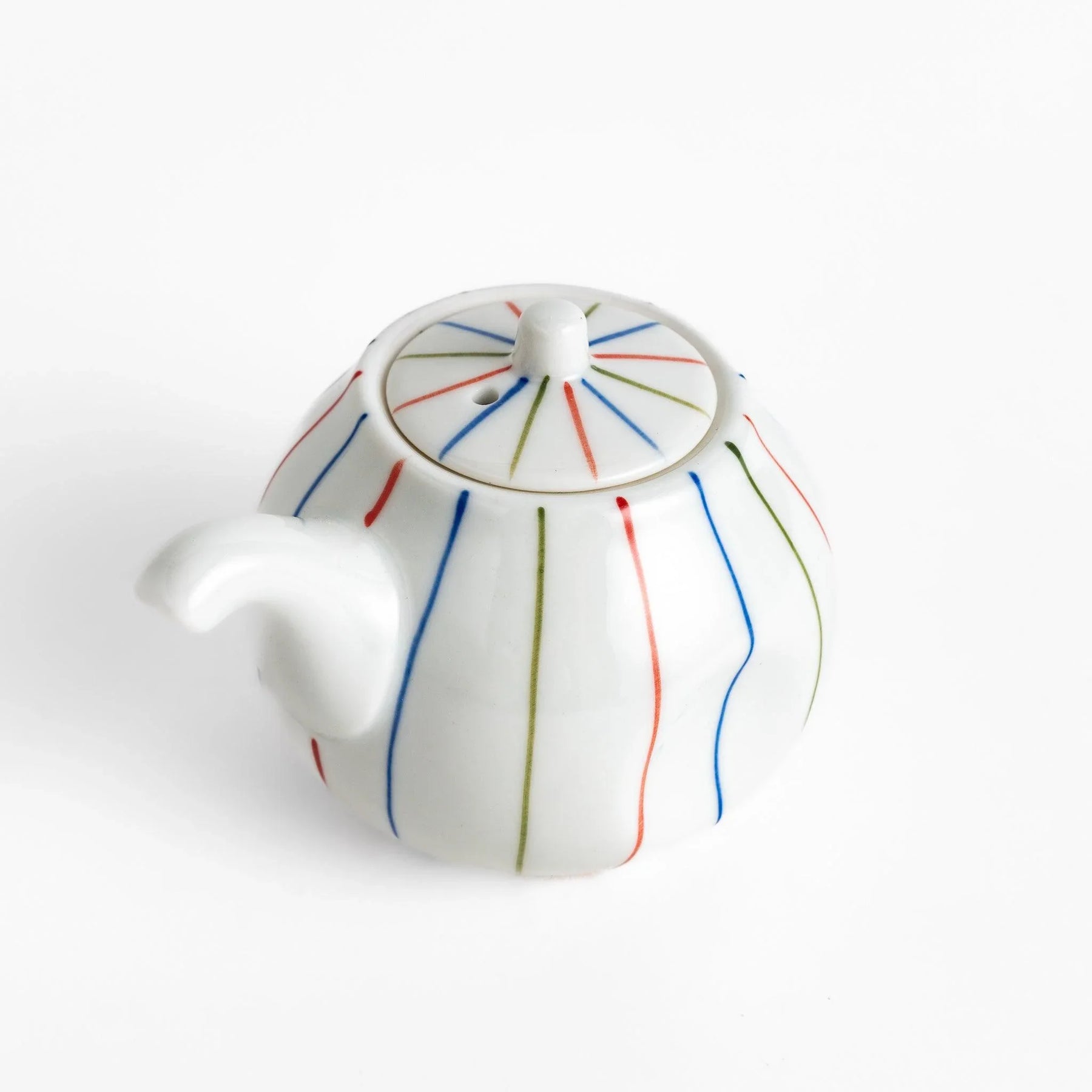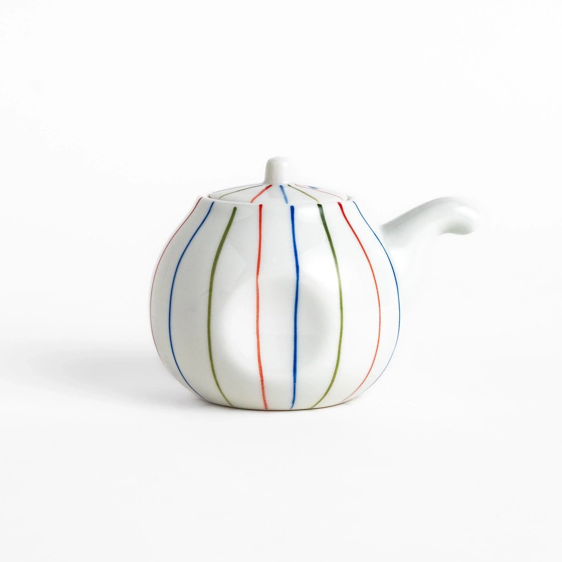 The Brocade Striped Soy Sauce Dispenser brings a cheerful touch of tradition to the table with its slender stripes in red, blue, and green. The vertical line motif, called tokusa, has long been admired in Japan for its simplicity and sense of balance, here expressed in a lively multicolor design. The smooth white porcelain provides a bright backdrop that makes the colors stand out beautifully.