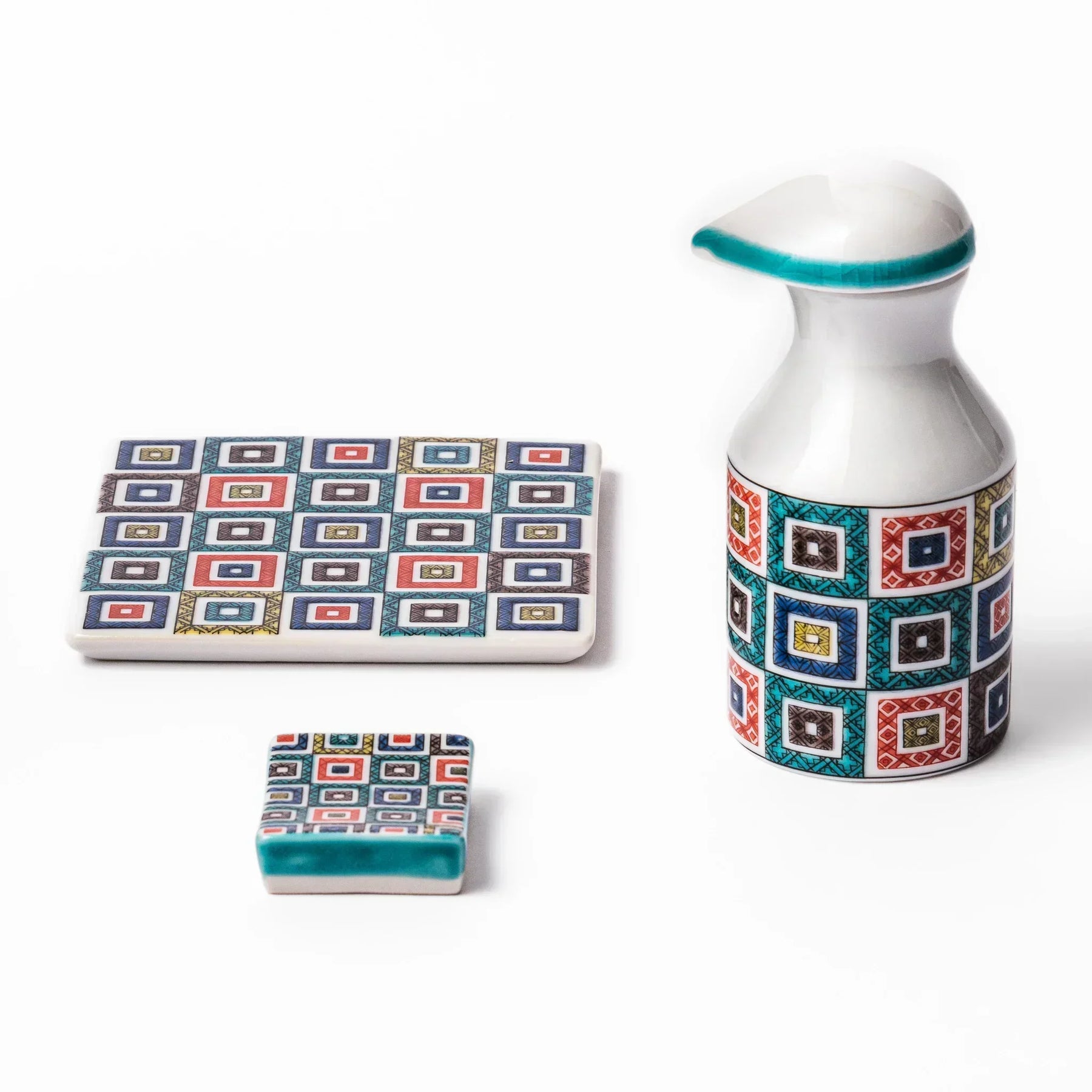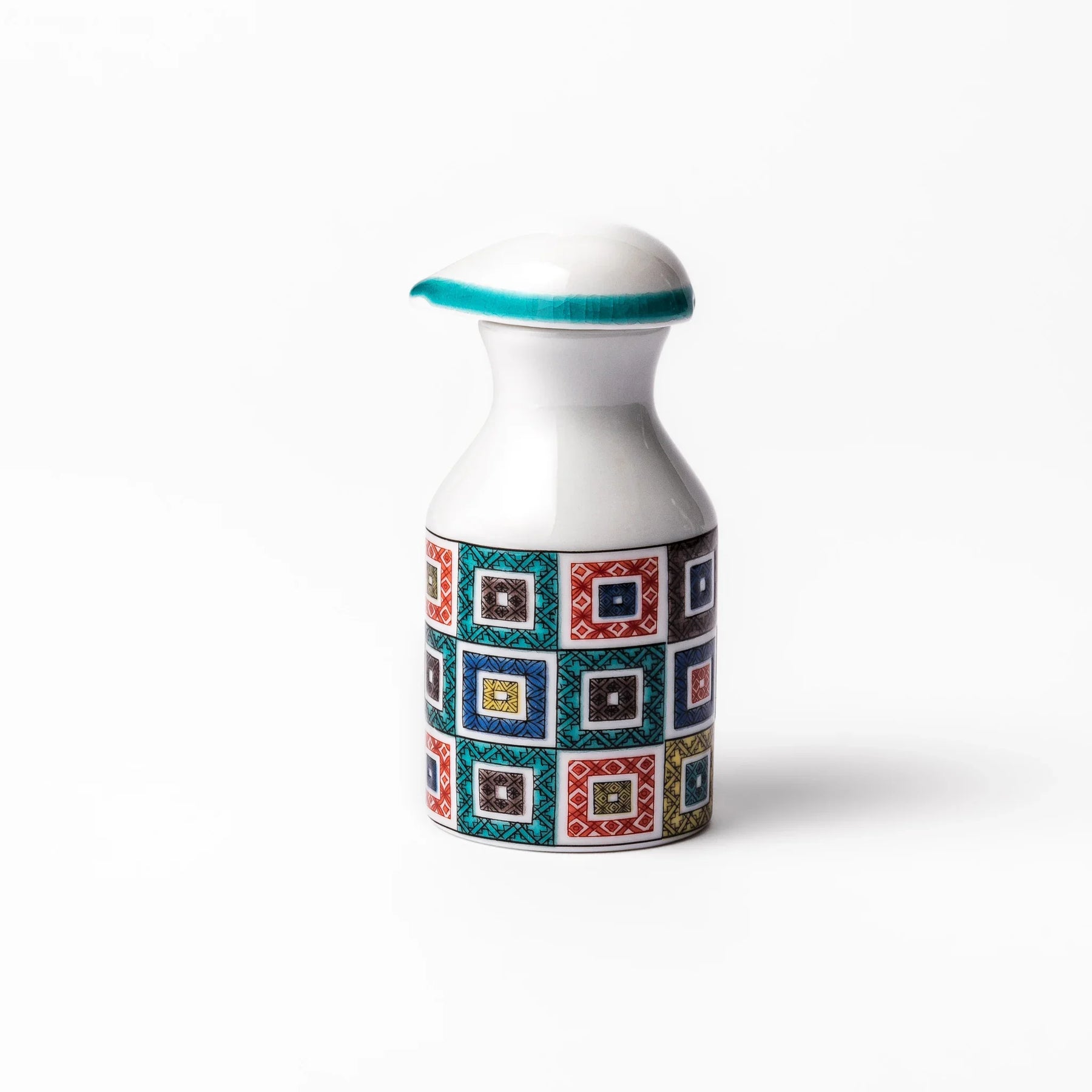 Elevate your table with the vivid charm of the Cobblestone Mosaic Soy Sauce Dispenser, a beautifully crafted piece inspired by classic Ko-Kutani porcelain. Featuring the traditional ishidatami (cobblestone) pattern, this dispenser is adorned with colorful enamel squares—each intricately detailed in bold hues of red, blue, green, yellow, and black.