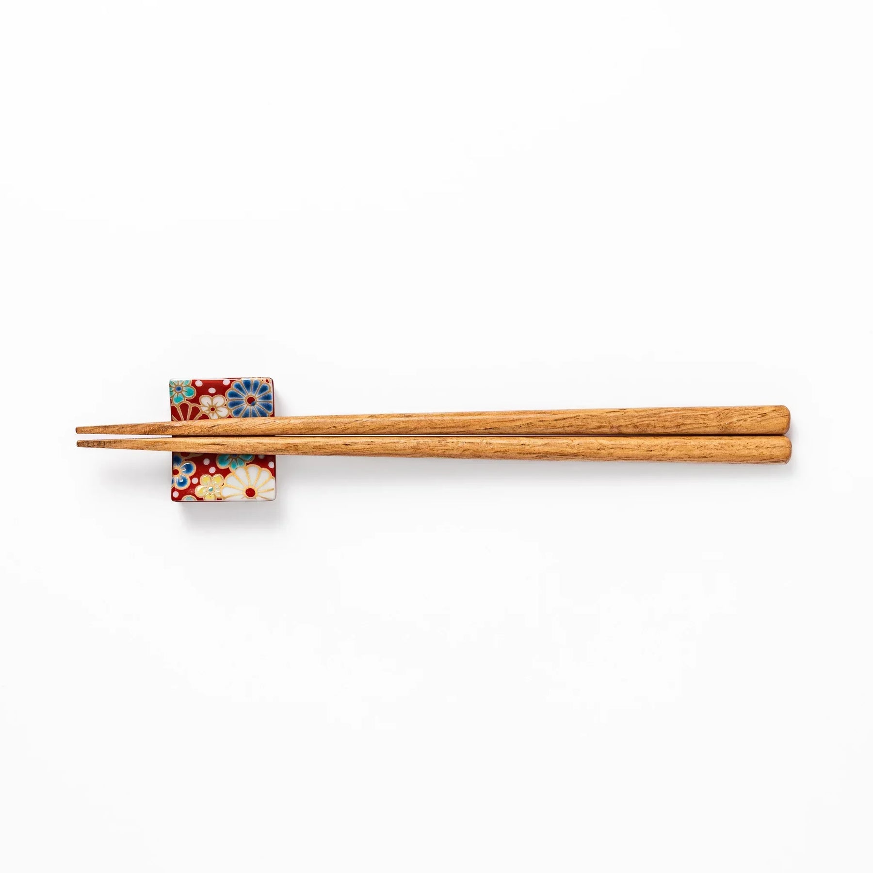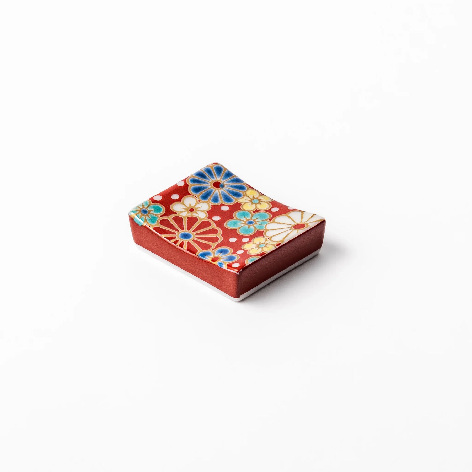 Add a burst of seasonal charm to your table with the Plum & Chrysanthemum Blossom Chopstick Rest. This hand-glazed porcelain hashioki features a classic Japanese floral motif in vibrant hues of plum red, soft blue, and golden yellow, inspired by traditional Kutani ware.