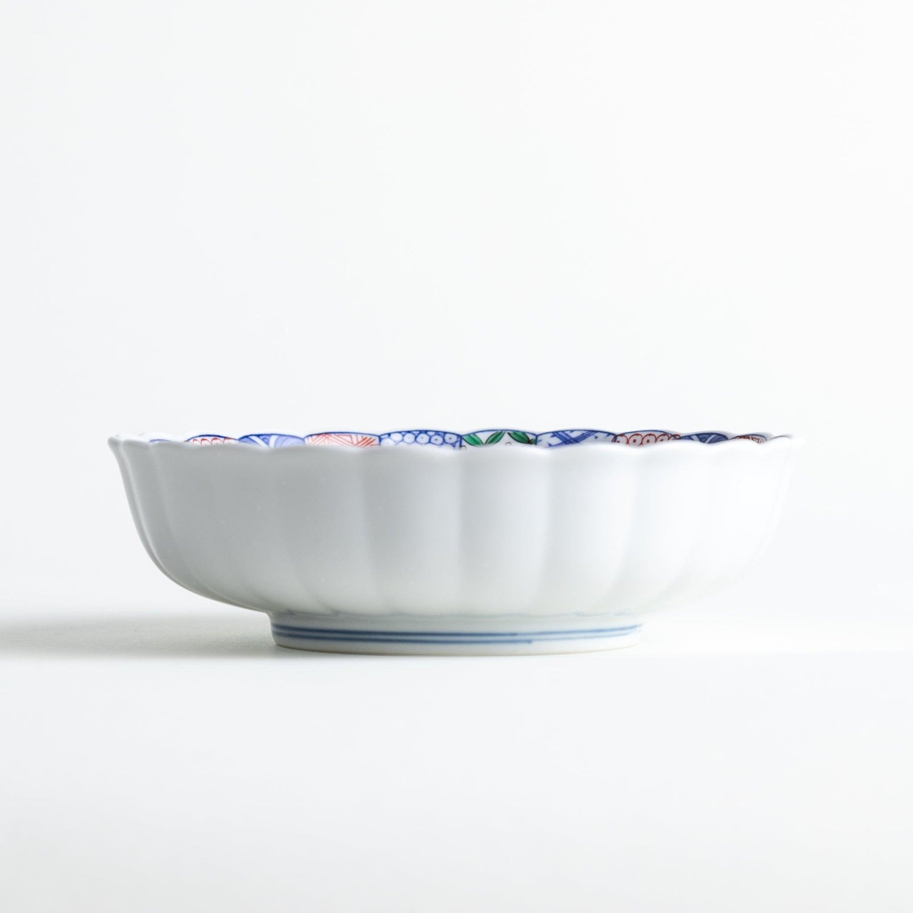 The Bellflower Radiant Cereal Bowl celebrates the rich artistry of Imari Ware, blending elegance with cultural meaning. Inspired by the Ko-Imari brocade style, the surface is adorned with intricate chrysanthemum patterns in vivid blue, contrasted with red, green, and yellow accents that radiate energy and refinement. The scalloped rim recalls the soft curves of flower petals, adding depth and grace to the design. At the center lies a pomegranate motif, an auspicious symbol of fertility, prosperity, and good fortune, making this bowl not only beautiful but meaningful.