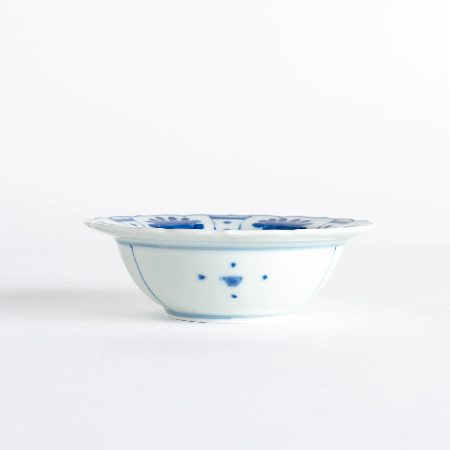 The Deer Dessert Bowl, crafted in Arita ware, features a graceful fluted rim and wide top edge that beautifully frames its intricate blue-and-white design. At the center, two deer are depicted in a tranquil natural setting, a motif that reflects traditional Japanese artistry and a timeless connection to nature. Surrounding this scene, the inner rim is adorned with alternating floral and geometric elements, creating visual depth and balance.