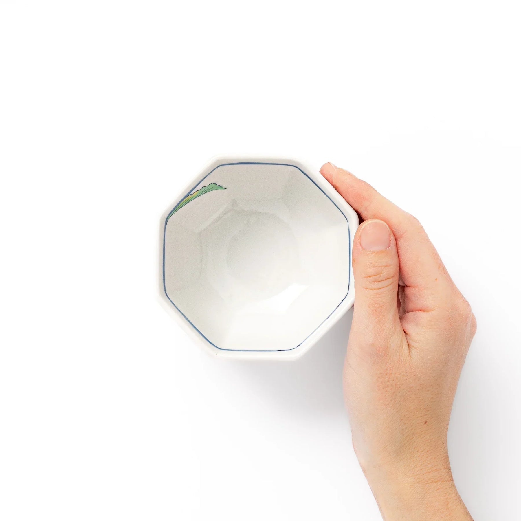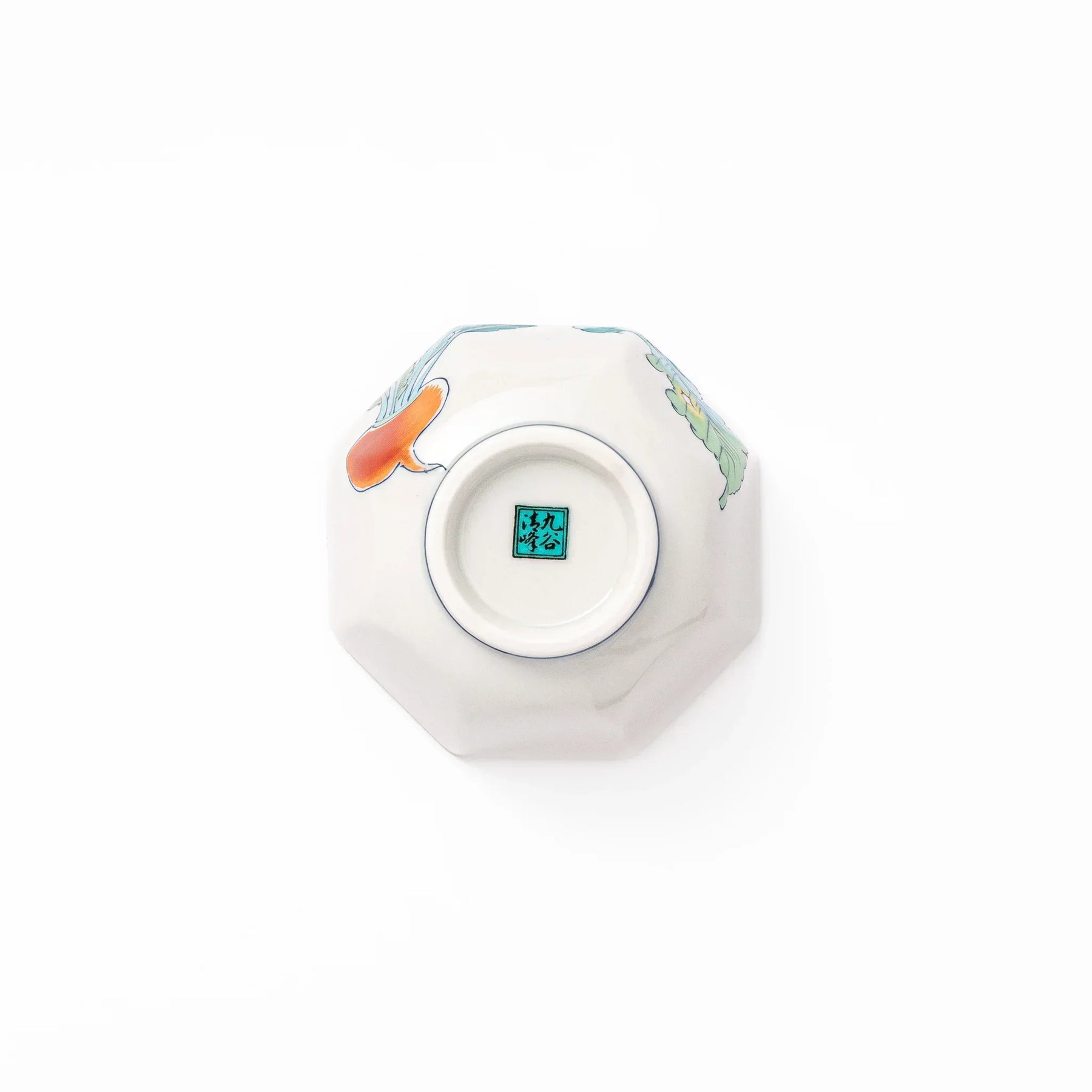 This is a fine example of Kutani ware, known for its vivid colors and expressive brushwork. The porcelain surface has a soft gloss that enhances the brightness of the design while maintaining a smooth, polished feel. The eight-sided form adds visual interest and frames desserts, fresh fruit, or side dishes with charm and clarity.