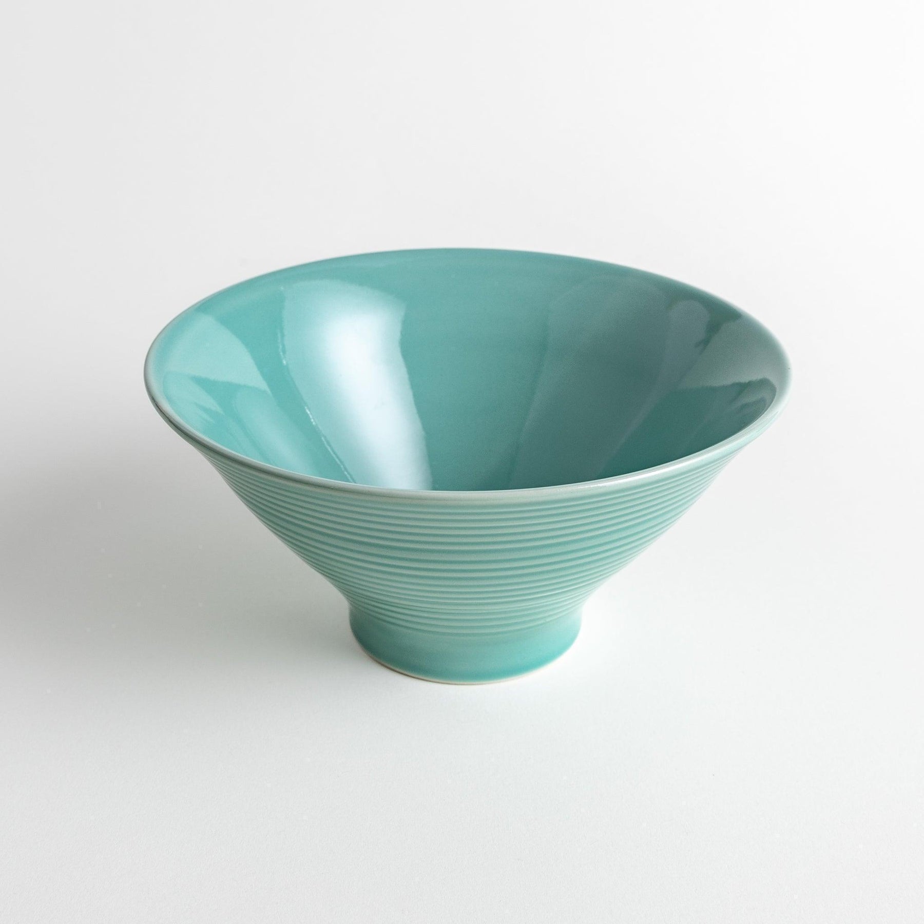 The Turkish Blue Ramen Bowl brings freshness and refined texture to your table with its vivid blue glaze and elegant form. Crafted from Mino ware, this bowl features delicately carved horizontal ridges known as sendan or “thousand steps,” creating a rhythmic surface that plays with light and touch. Its high footed base adds lift and balance, giving the bowl a distinct silhouette that is both modern and rooted in tradition.