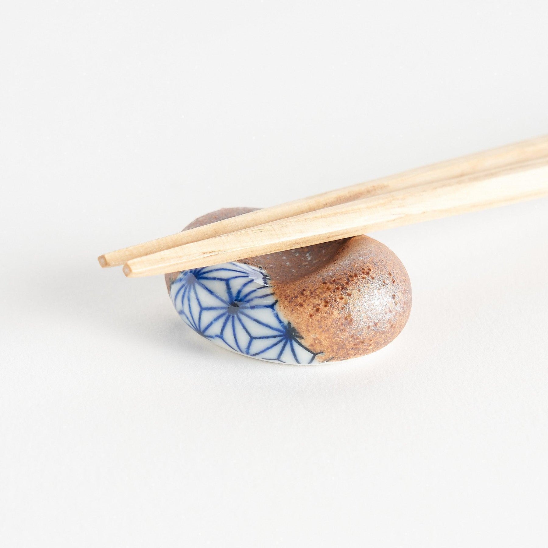 The Rustic Hemp Star Chopstick Rest brings together earthy texture and timeless Japanese design. Its bean-like form is crafted from natural stoneware, with part of the surface left raw to highlight its rustic character. The remaining section reveals a smooth white glaze adorned with the traditional blue hemp leaf pattern, known as asanoha.