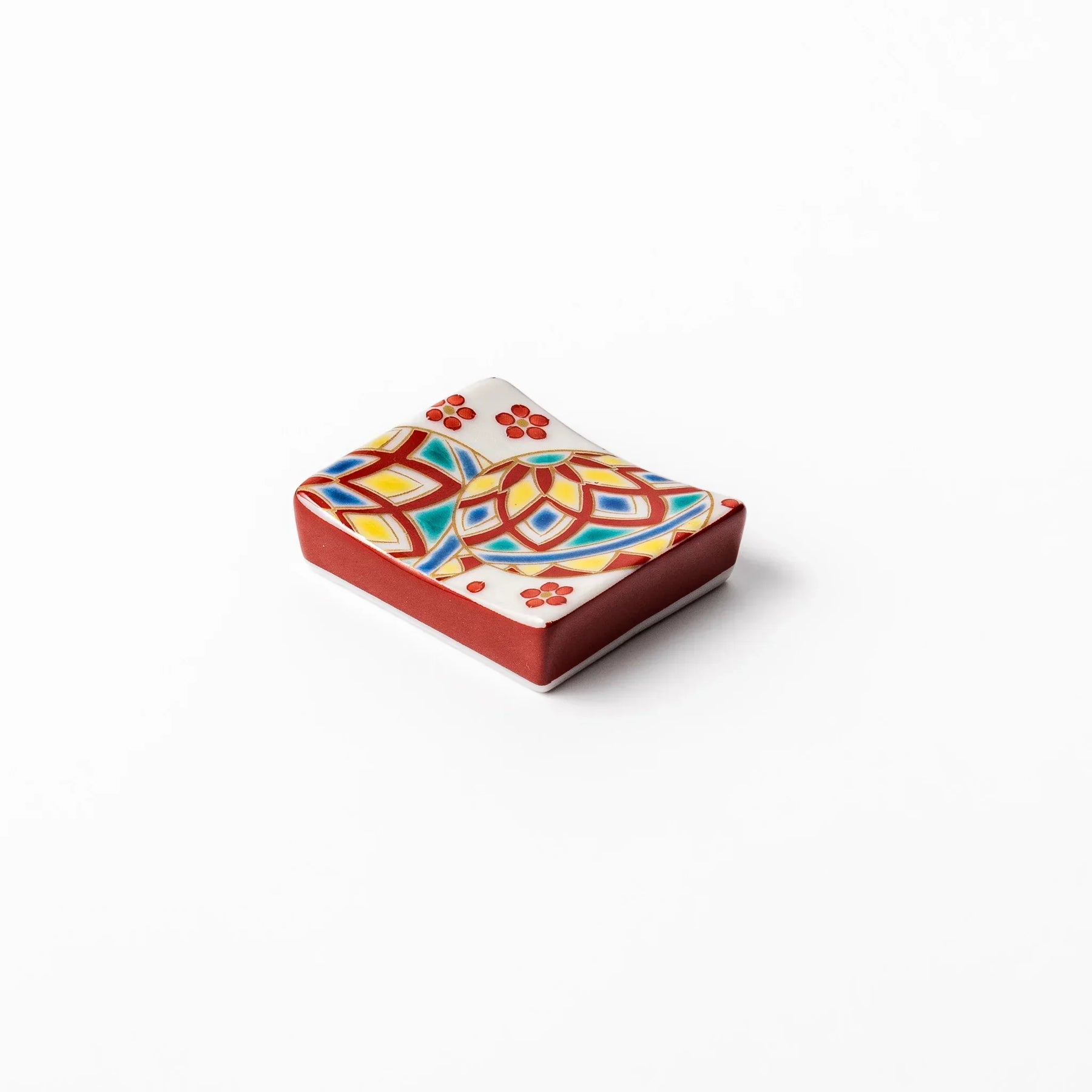 Crafted in Japan, this porcelain chopstick rest showcases vivid reds, blues, yellows, and greens in a dynamic, symmetrical motif that brings festive flair to any table setting. The Temari Ball Chopstick Rest is perfect for adding a cheerful pop of color and cultural elegance to everyday meals or special occasions.