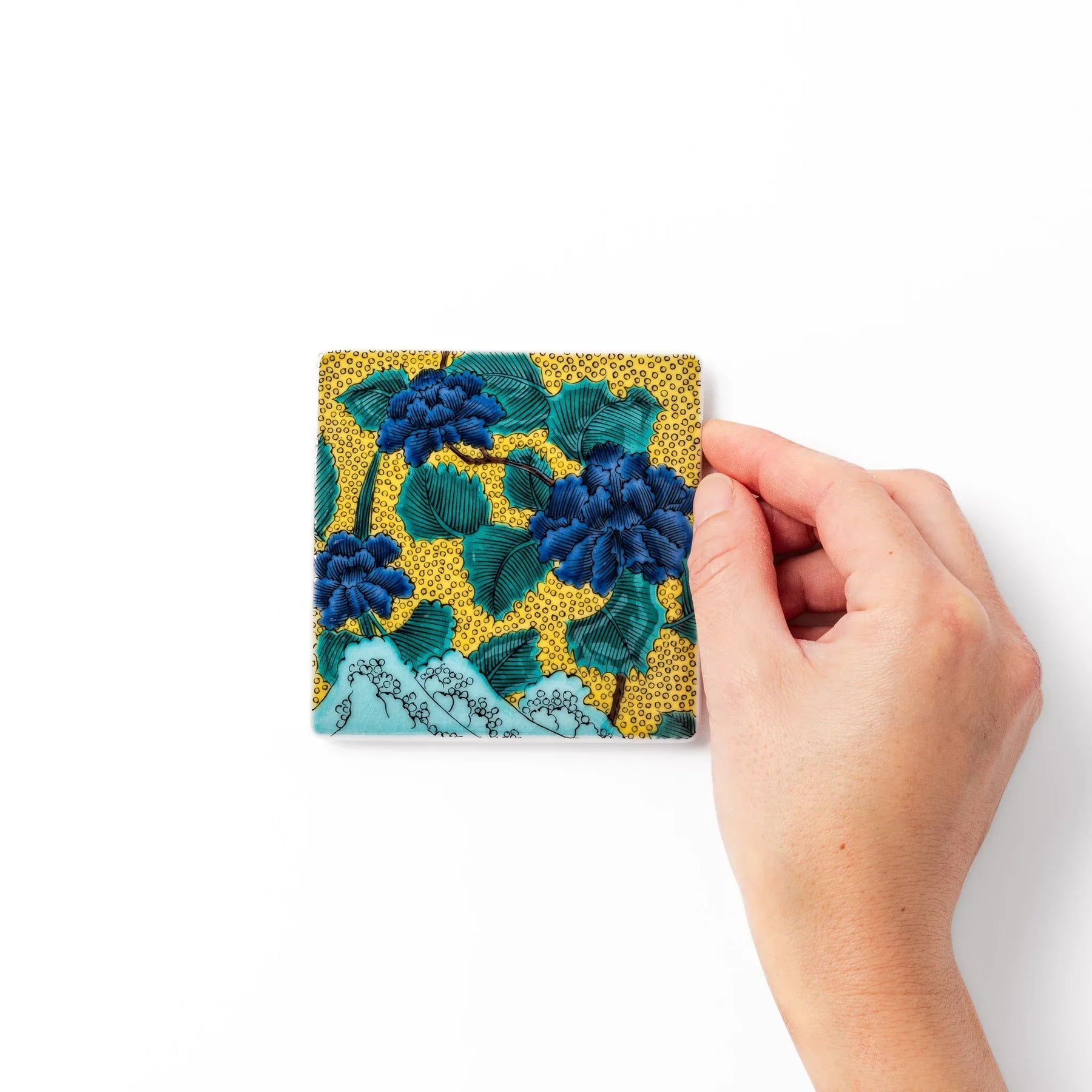 A delicate wave motif anchors the design, adding a touch of traditional Japanese artistry. Inspired by the aode (blue hand-painted) style, the Blue Peony Garden Coaster is perfect for hot or cold drinks, combining timeless beauty with practical elegance.