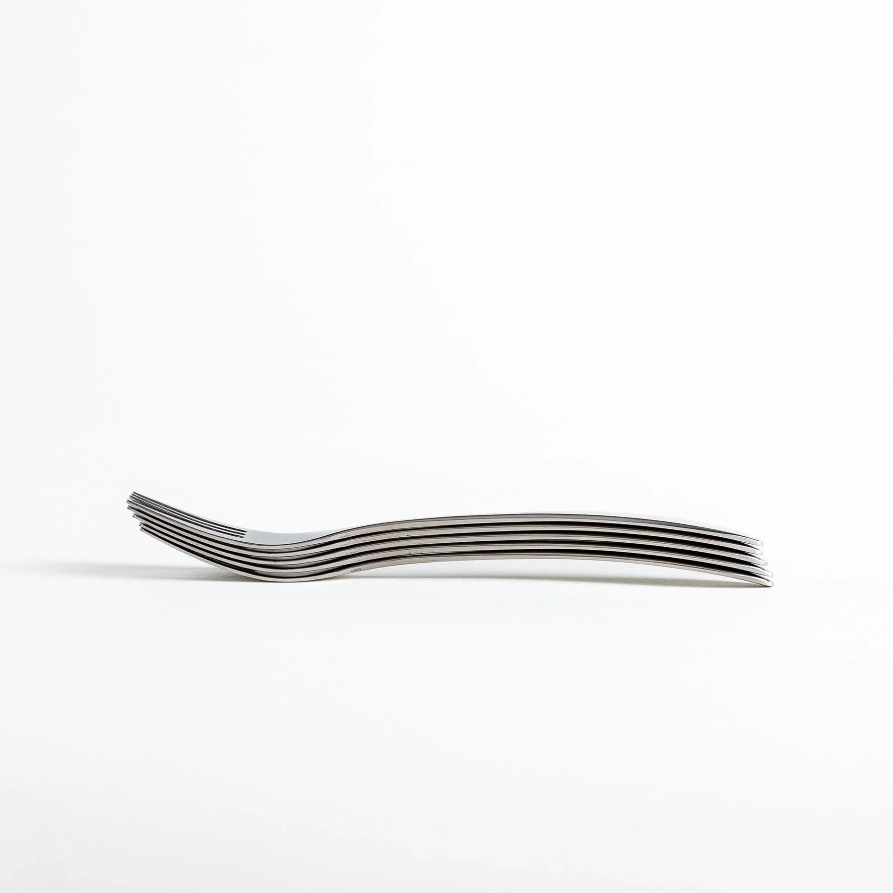 Refined simplicity for everyday dining. The Elegance Stainless Forks (5-Piece Set) are crafted to bring both beauty and comfort to the table. The beveled handles rest naturally in the hand, while the slim, gently elongated tines make each bite effortless and graceful.