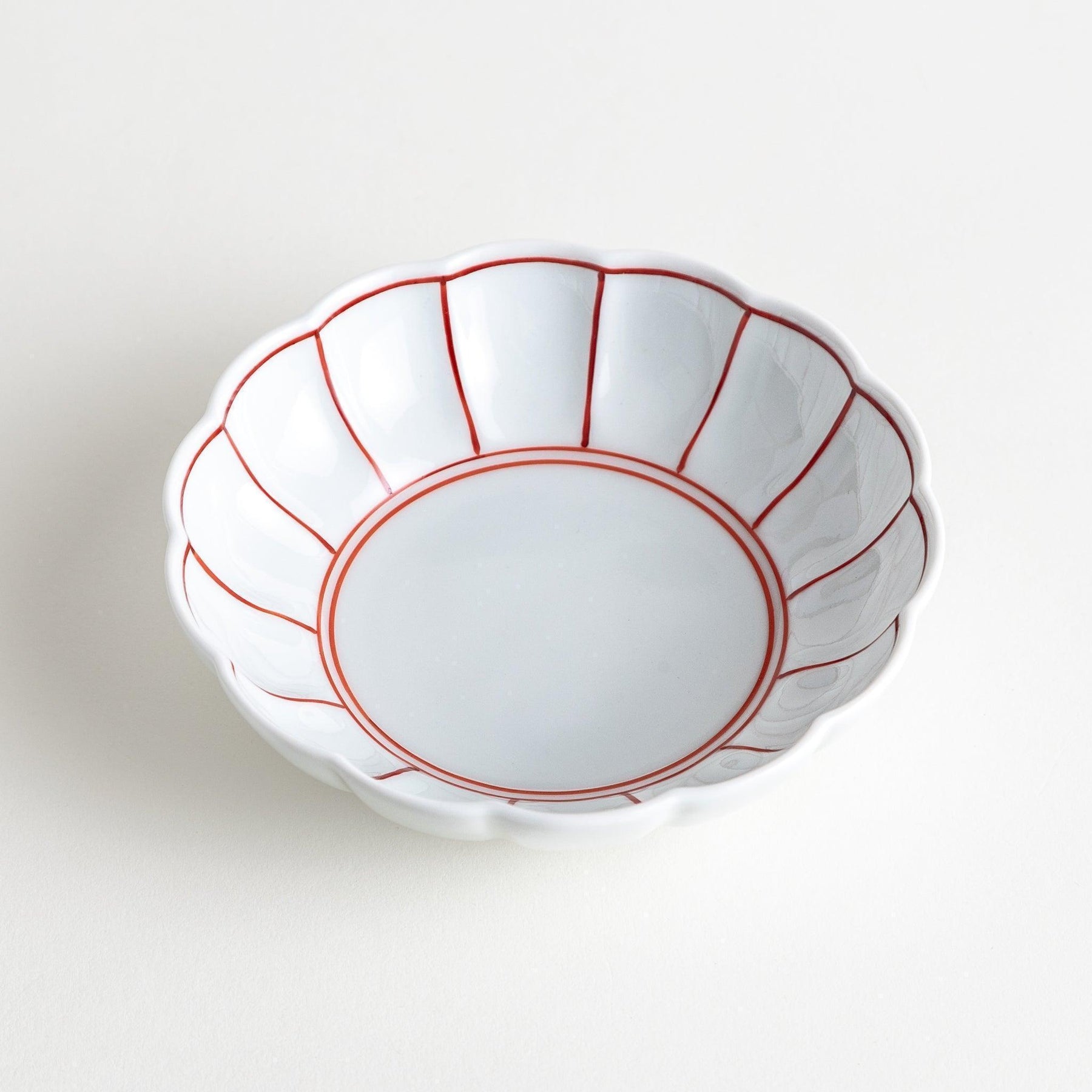 The Petal Radiance Dessert Bowl is a graceful piece of Arita ware that highlights the beauty of the chrysanthemum, a flower long admired in Japan for its elegance and symbolism. Its softly scalloped rim echoes delicate petals, while the crisp brush-painted lines radiate from the center to create a design that feels both simple and refined. A glossy transparent glaze completes the piece, enhancing its clarity and charm.